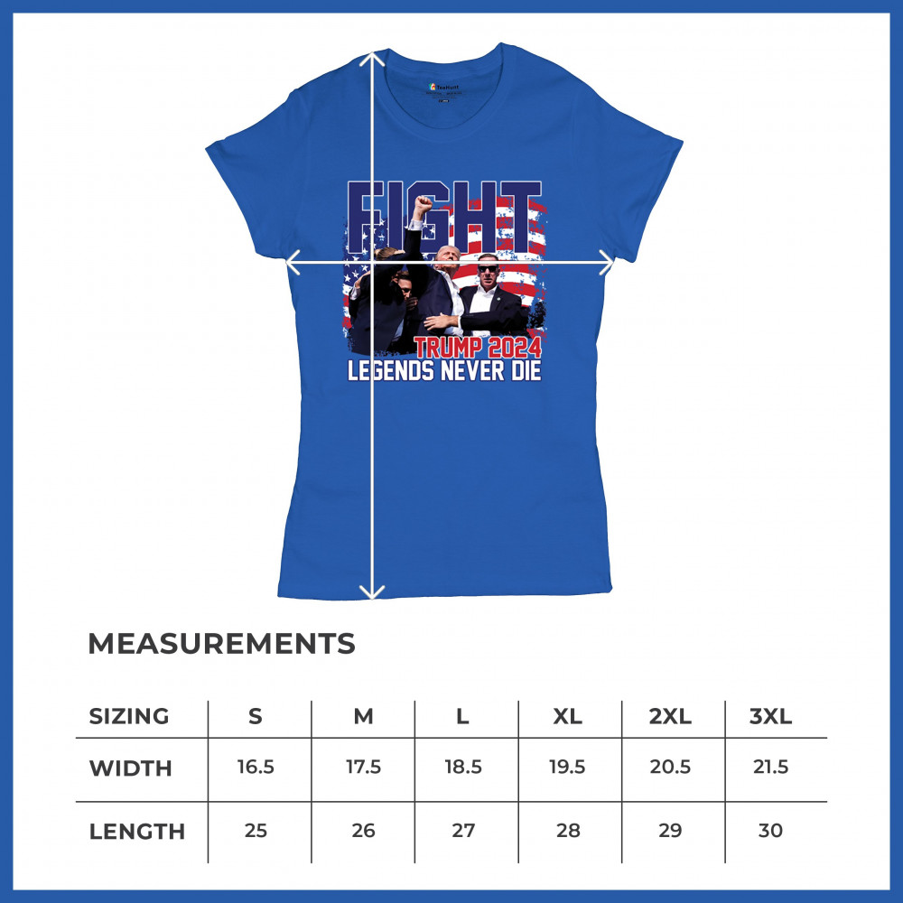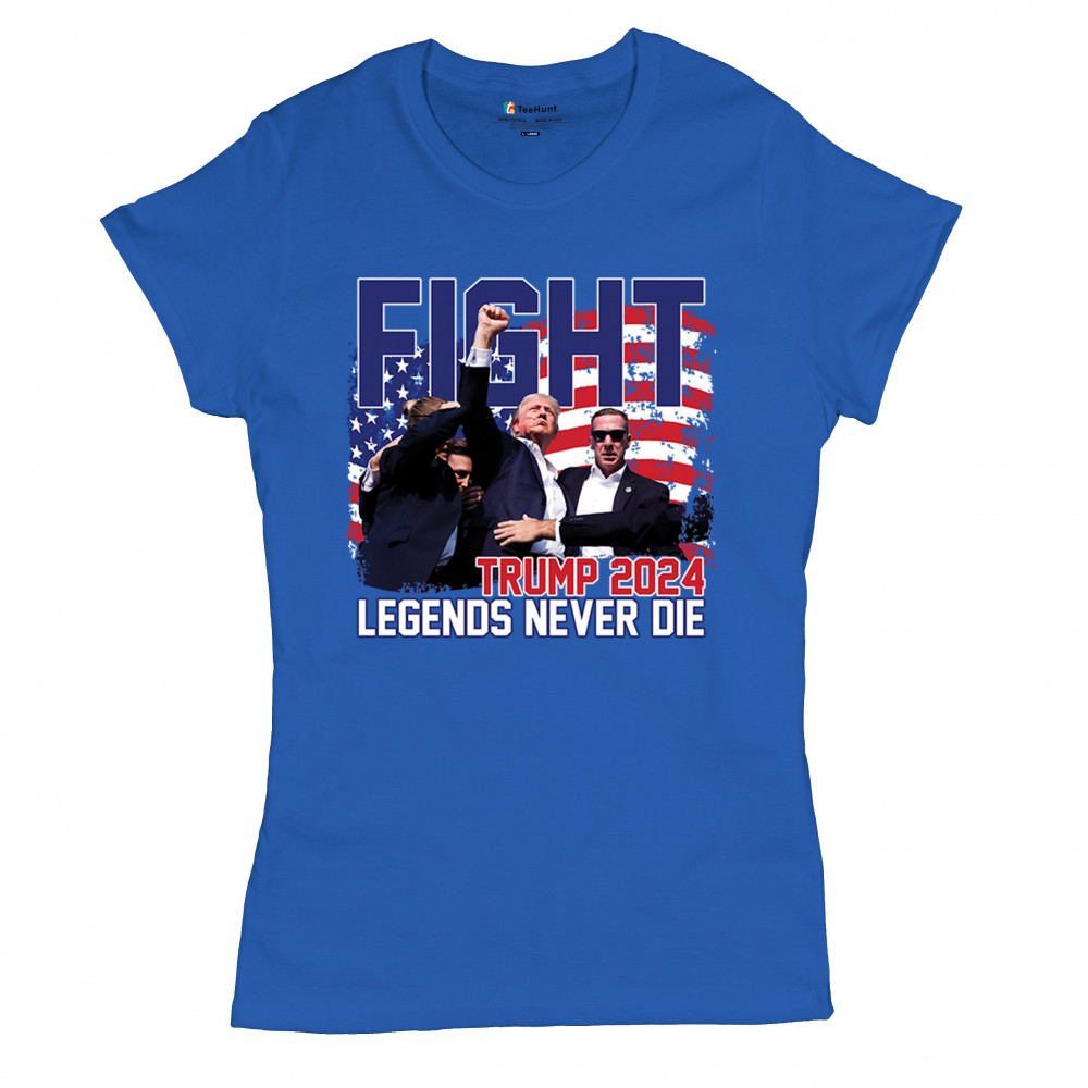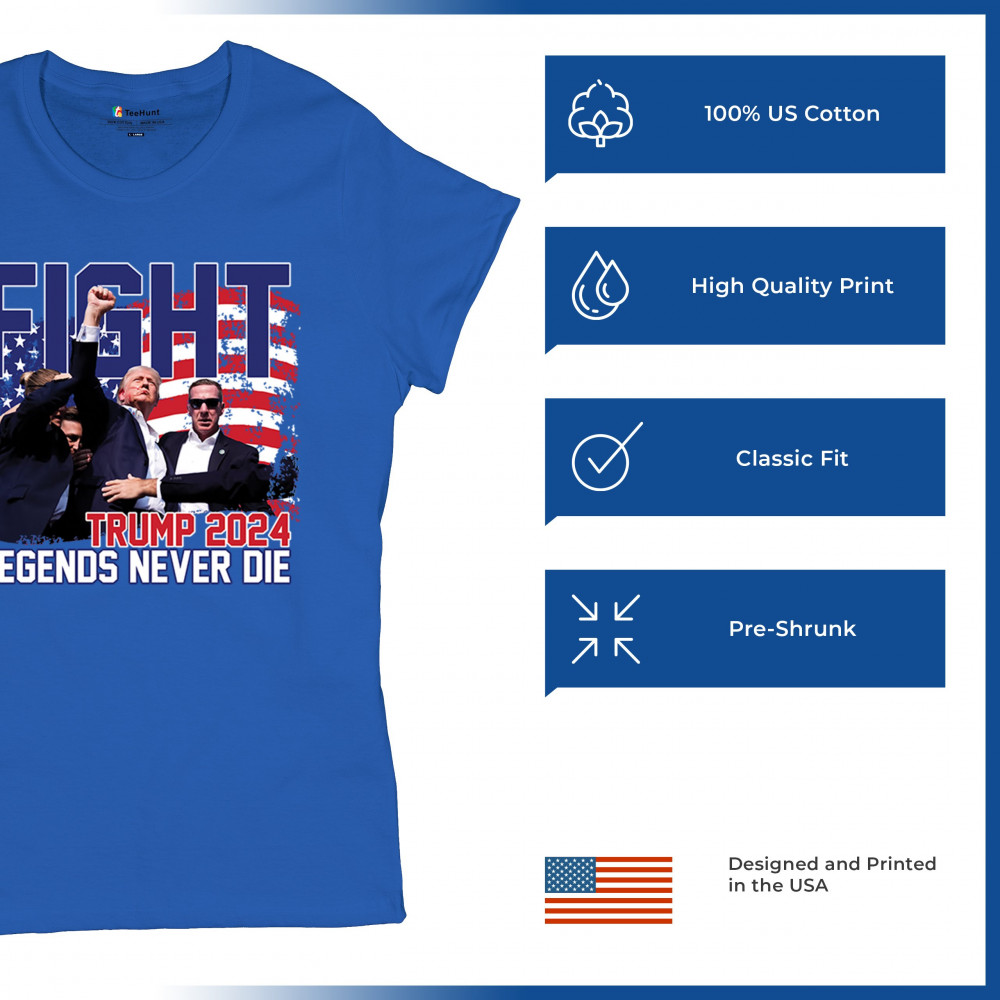 Show your Trump 2024 support with our bold "Fight" design, featuring "Legends Never Die" and a patriotic American flag. Perfect for rallies and everyday wear.