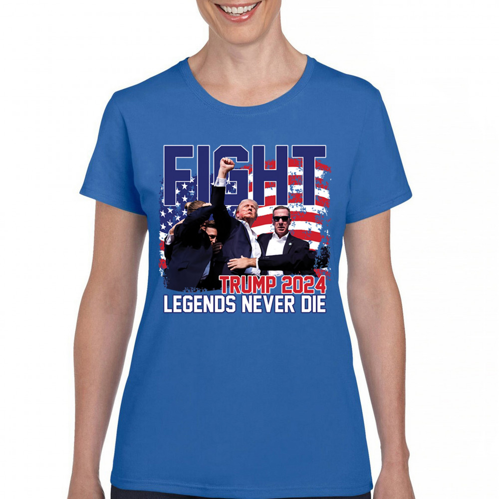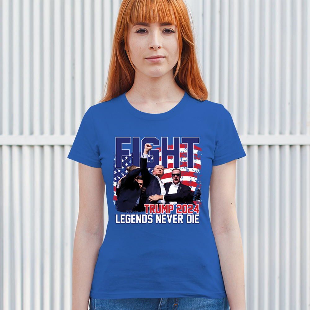 Stand proud and show your support for the Trump 2024 campaign with our exclusive "Fight" design. This striking graphic features Donald Trump alongside the inspiring phrase "Legends Never Die," set against a patriotic American flag backdrop. Ideal for rally events and everyday wear, this design captures the spirit of determination and victory. It’s perfect for those who stand by conservative values and trust in Trump's leadership. Celebrate your patriotism and join fellow supporters in making a bold statement for America's future with this must-have design.