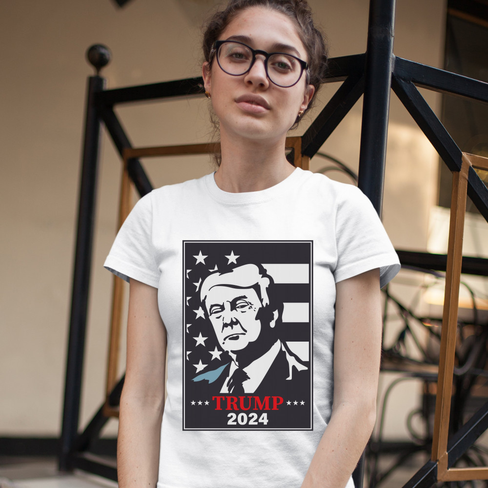 A political print featuring Donald Trump with the American flag in the background. The print says: "Trump 2024". A great choice to show your support for Donald J. Trump - the 45th president of the USA!