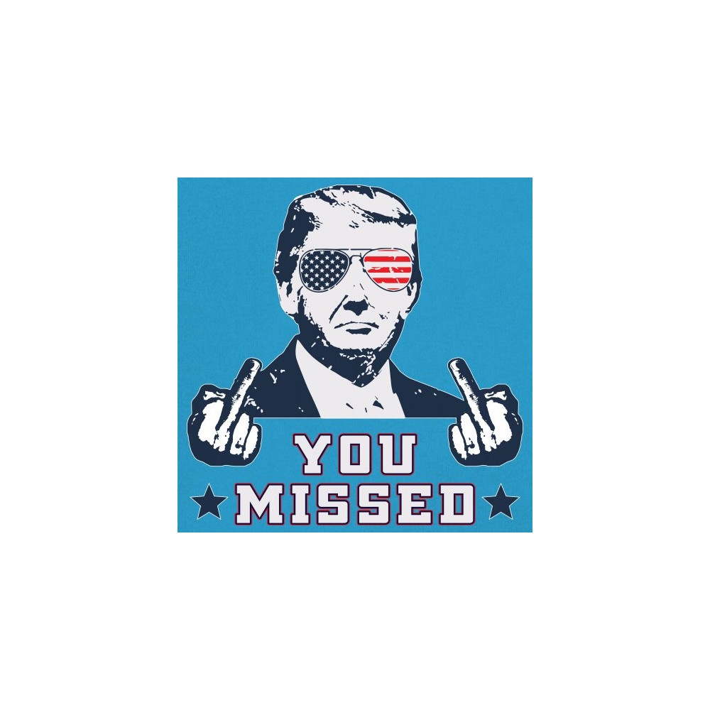 Express your patriotism and support for Donald Trump with this striking "You Missed" design, commemorating his survival of an assassination attempt during a Pennsylvania rally. The design features Trump in American flag sunglasses, defiantly flipping the bird, a bold statement of resilience. Ideal for rallies, political events, or casual wear, it symbolizes strength and unwavering support for conservative values. Show the world where you stand with this unique piece, perfect for any Trump supporter who believes in the America First agenda.