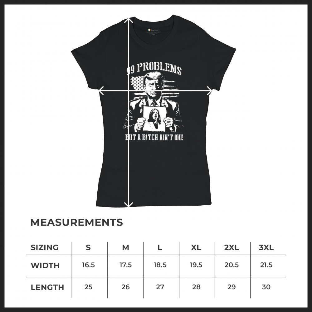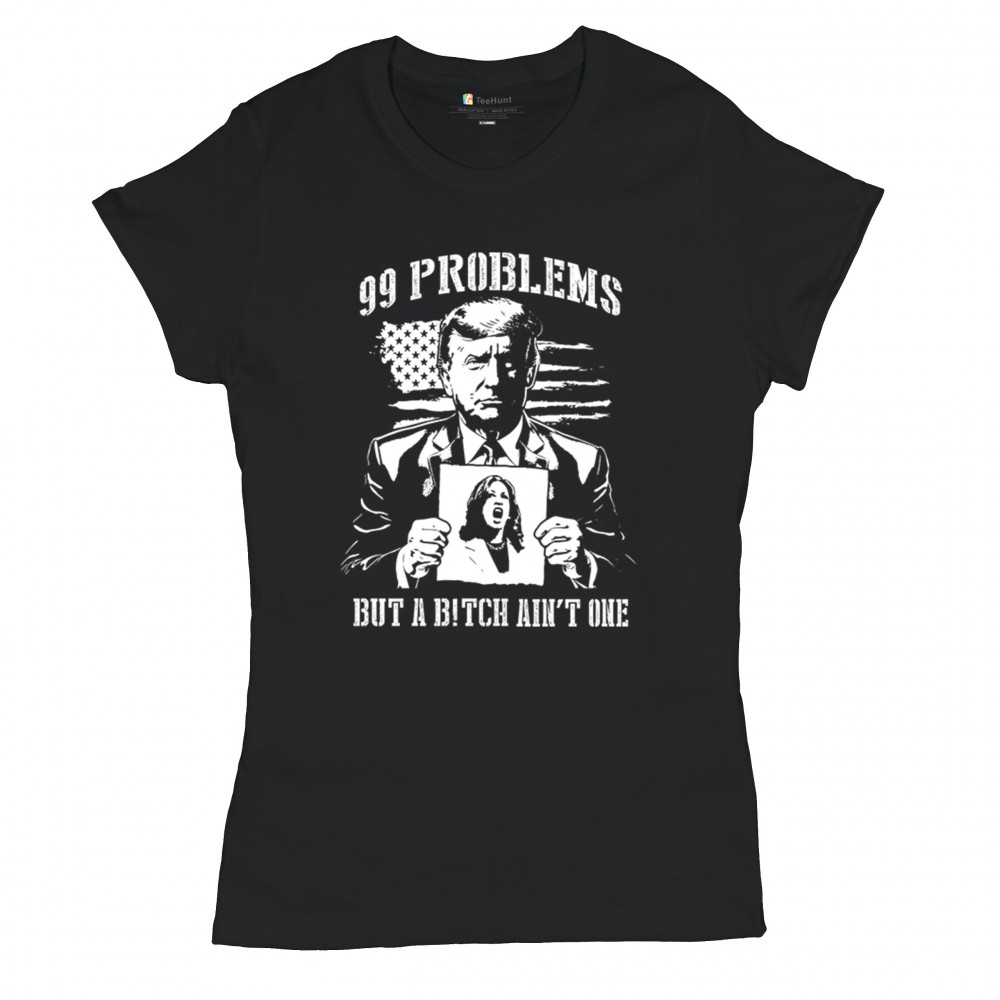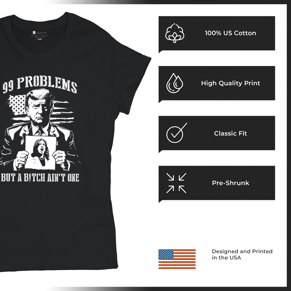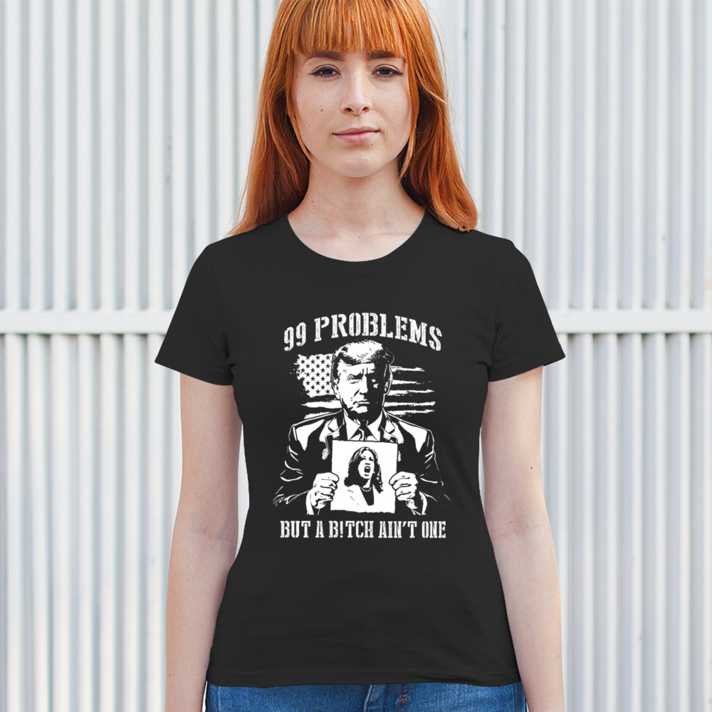 Bold conservative "99 Problems But a B*tch Ain’t One" design featuring Donald J. Trump and an American flag. Perfect for proud Republicans and patriots.