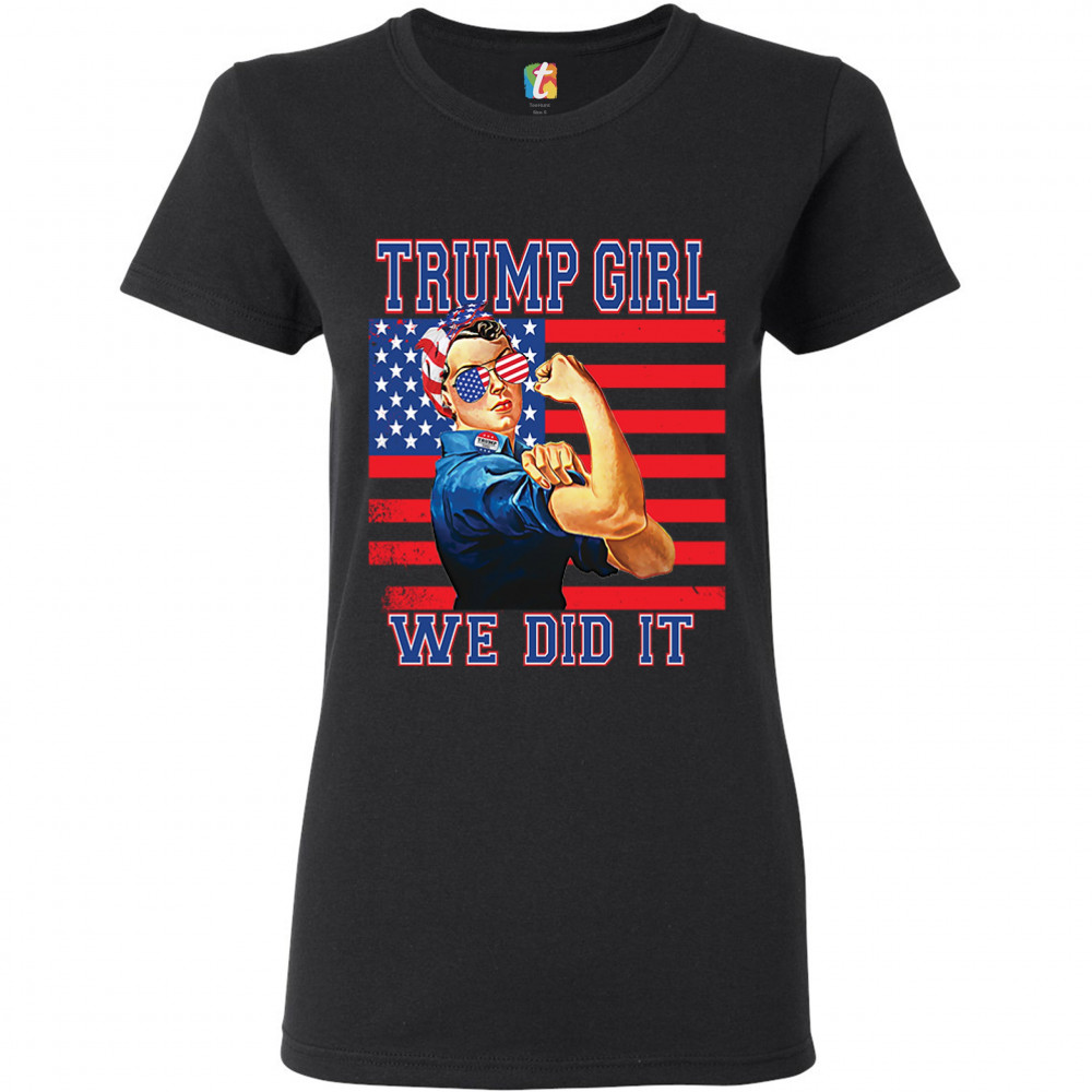 A political print saying "Trump girl, we did it". The print features the WWII icon Rosie the Riveter wearing American flag bandana and glasses. She also wears a "Trump 2020" badge. In the background there is the American Flag. A great choice to wear for a