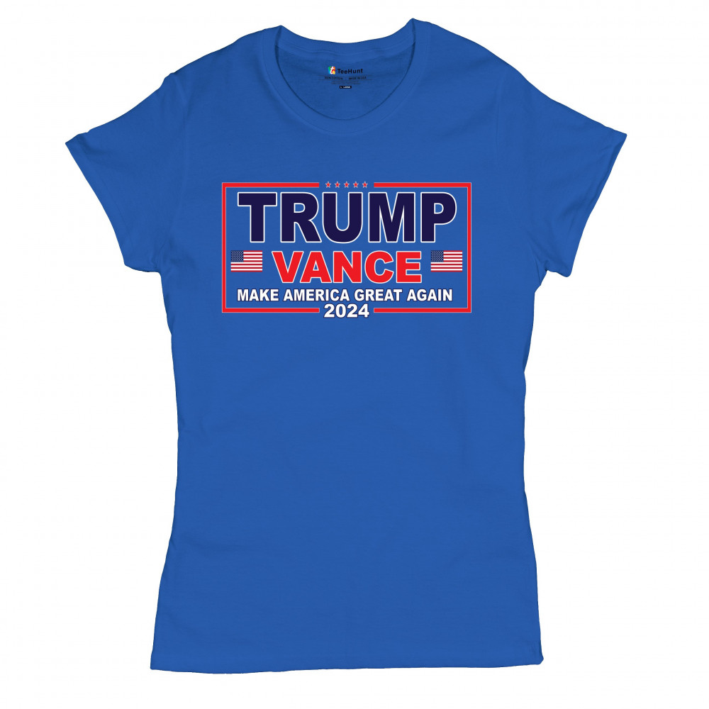 Showcase your support for the Trump-Vance 2024 campaign with this bold patriotic design featuring the American flag and "Make America Great Again" slogan.