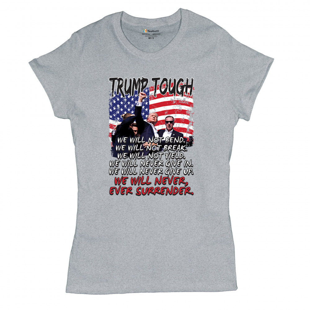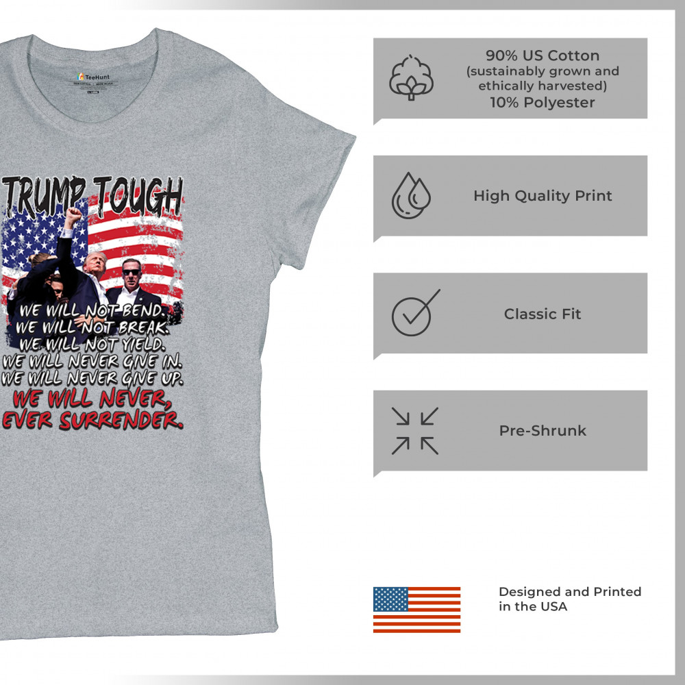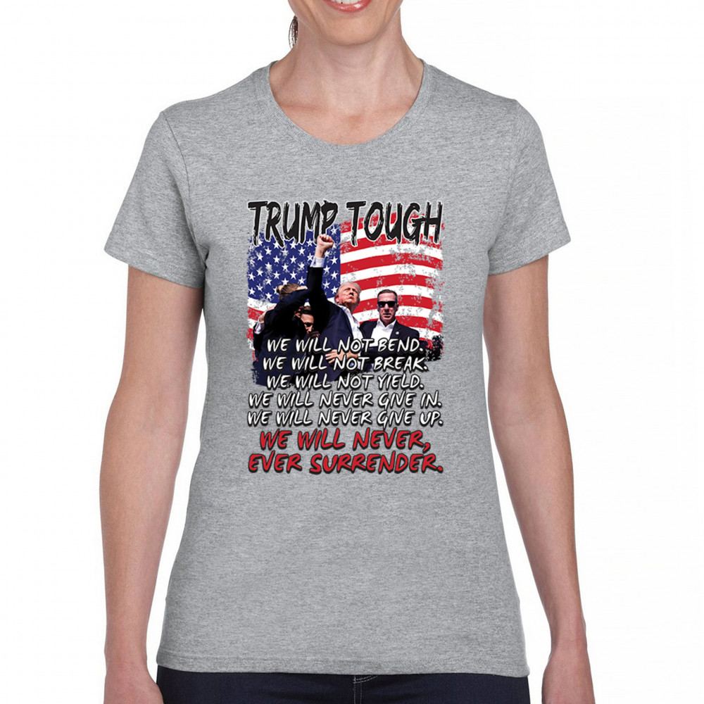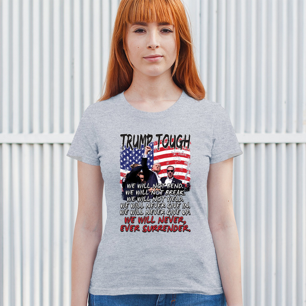 Express your support for Trump 2024 with this bold, patriotic design featuring the American flag and a powerful message. Never surrender your values.