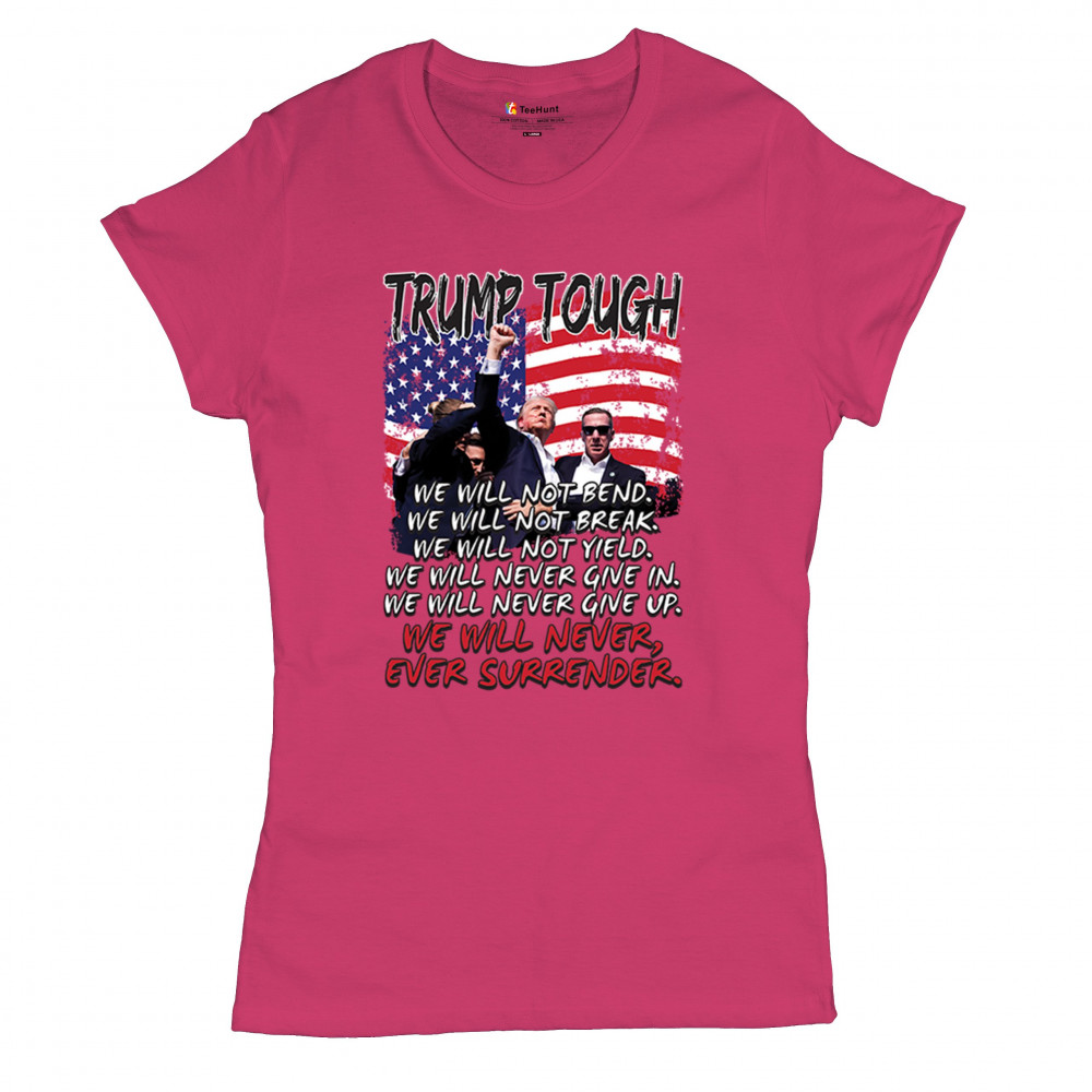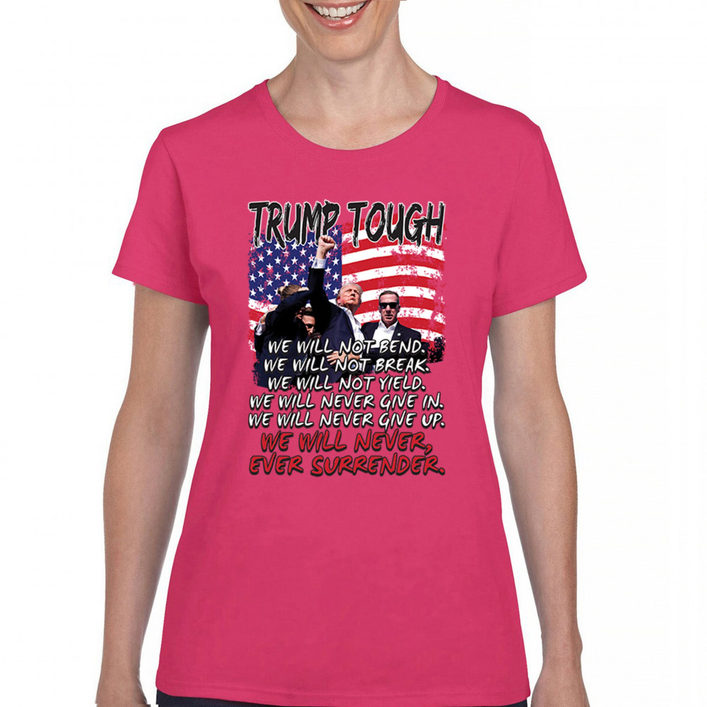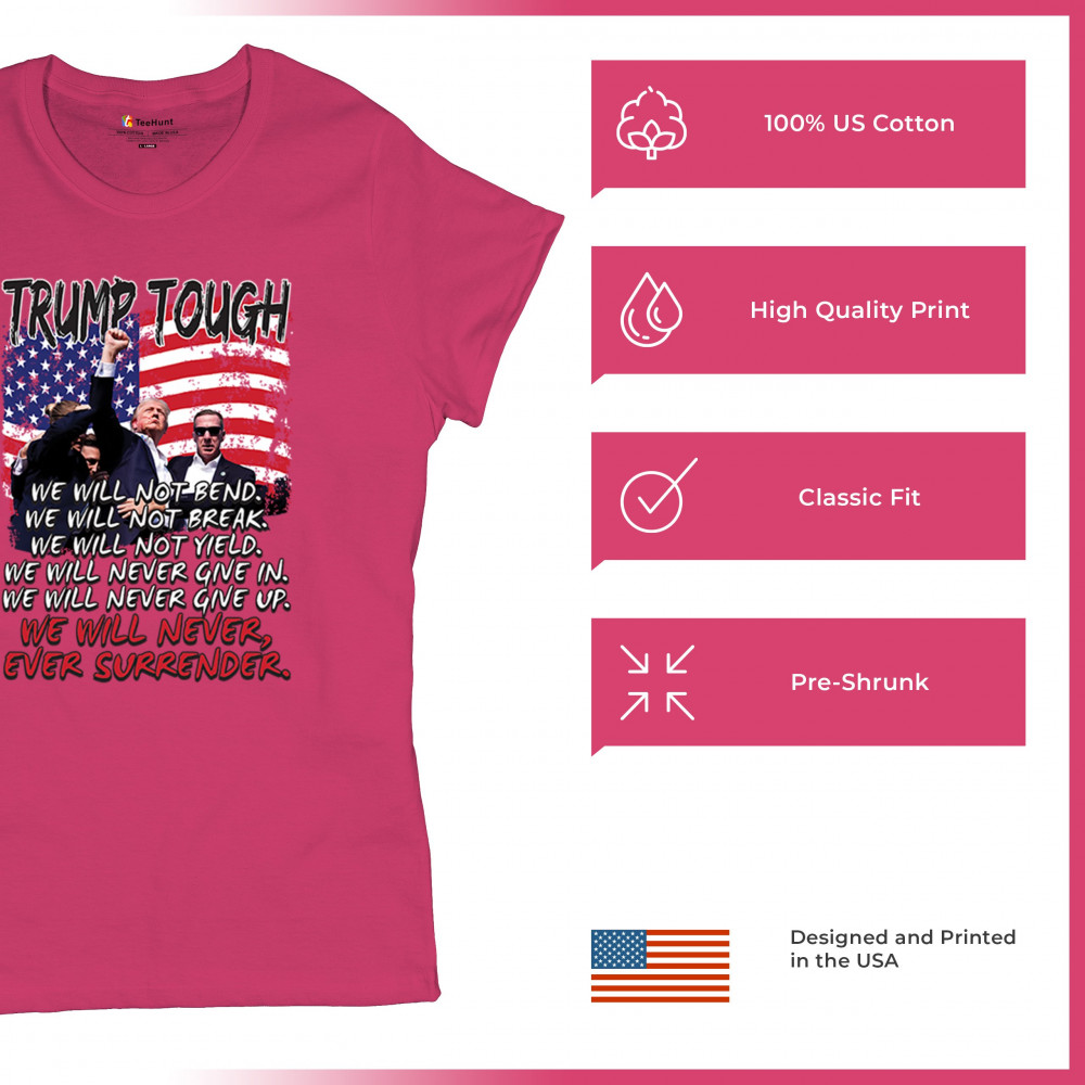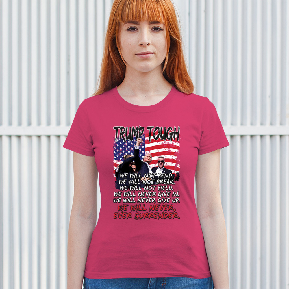 Express your support for Trump 2024 with this bold, patriotic design featuring the American flag and a powerful message. Never surrender your values.