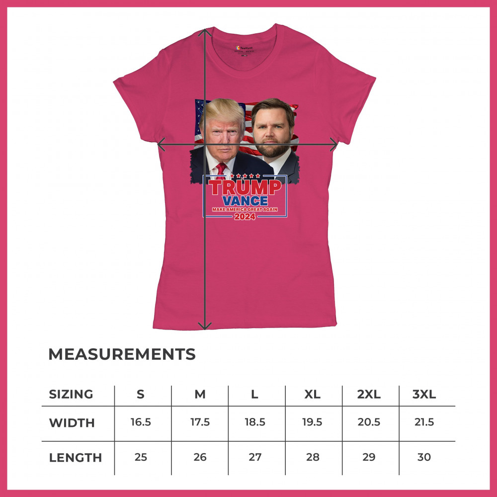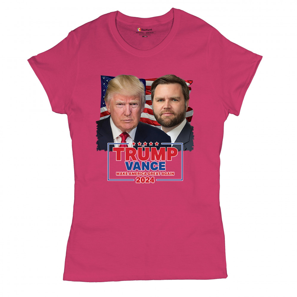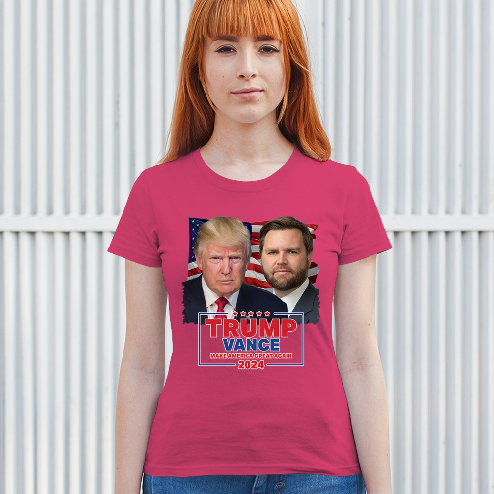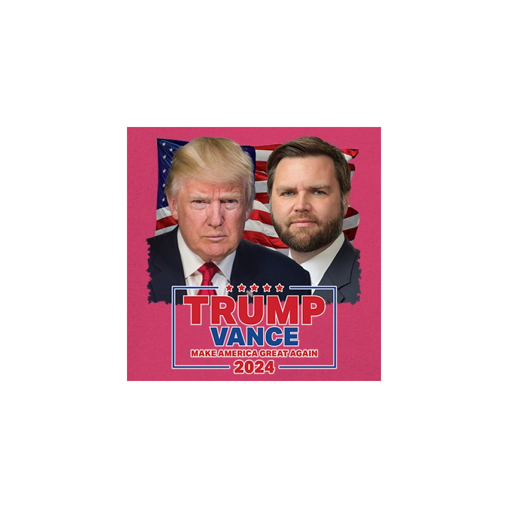 Show your support for Trump-Vance 2024 with this bold design featuring Trump and Vance against the American flag. Perfect for rallies and political events.