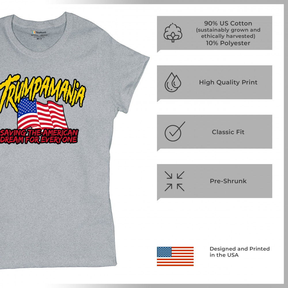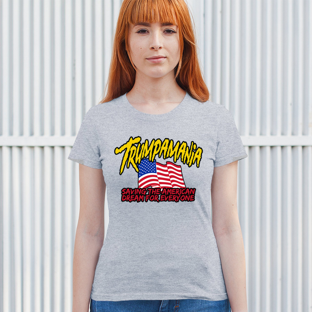 Celebrate the American dream with this powerful "Trumpamania" design. Perfect for rallies and beyond, this design captures the essence of conservatism and the fight for freedom. It’s a testament to the unstoppable spirit of those who trust in God and reject government overreach. With an American flag proudly displayed, this design aligns with the values of victory, rebellion, and unwavering support for Trump.