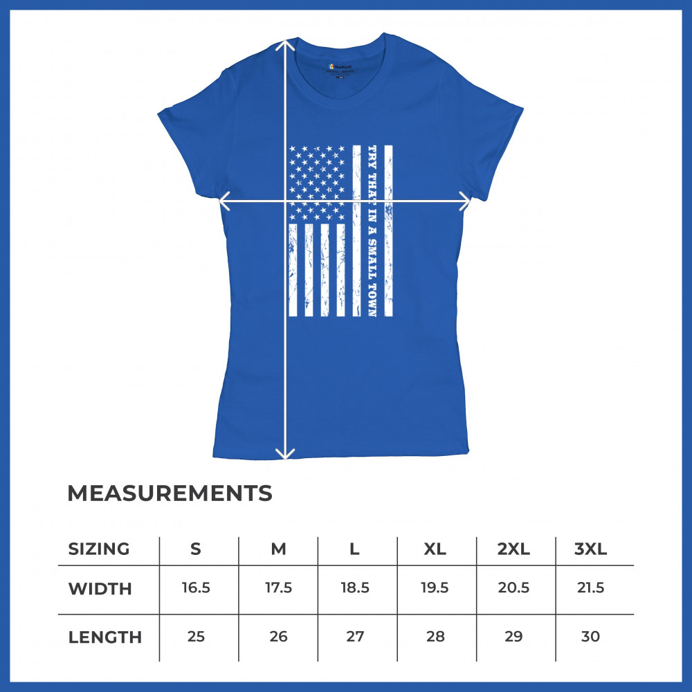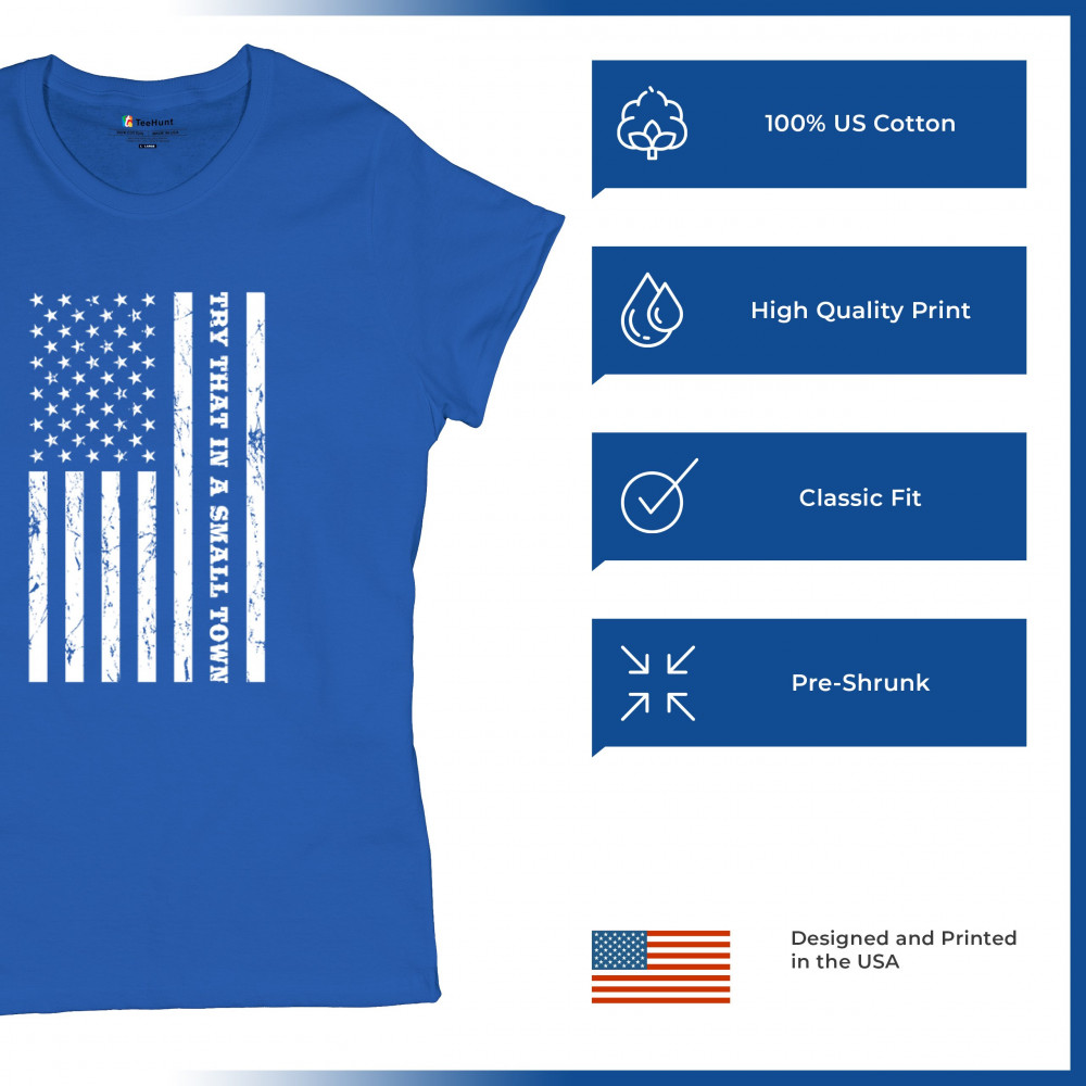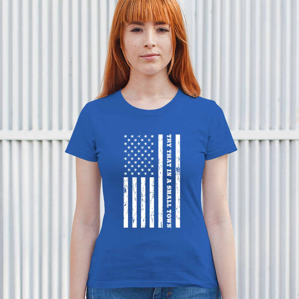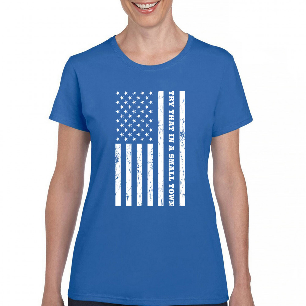 TRY THAT IN A SMALL TOWN GRUNGE AMERICAN FLAG t-shirt patriotic women's tee royal blue