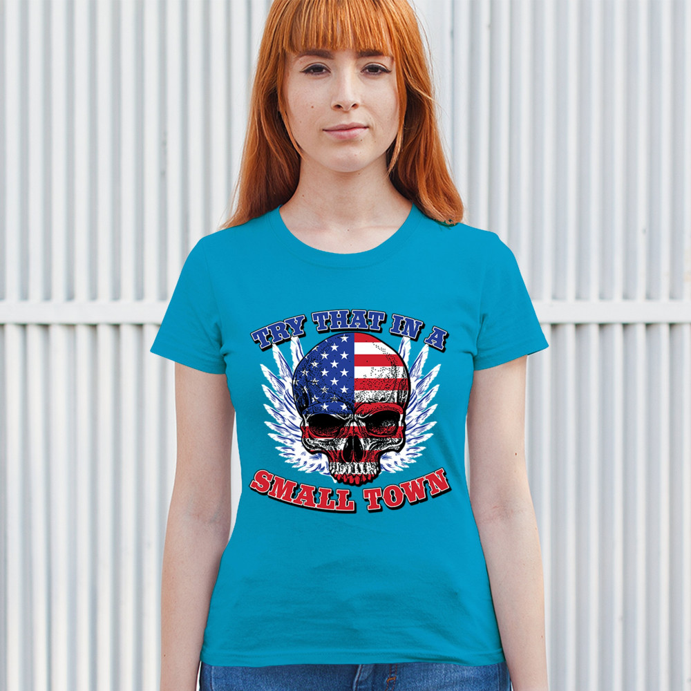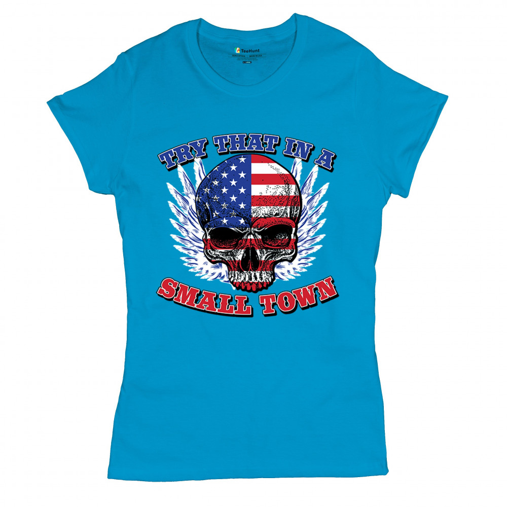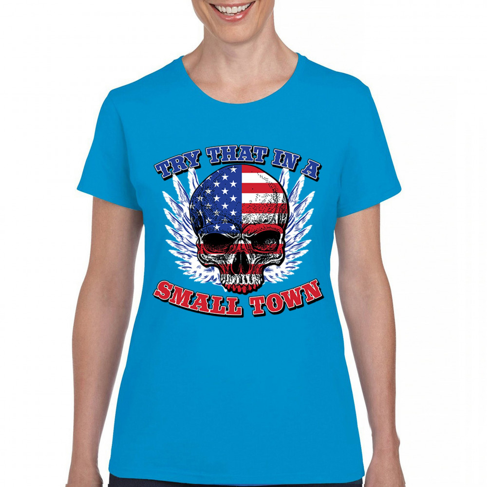 TRY THAT IN A SMALL TOWN t-shirt american flag skull country music women's tee light blue