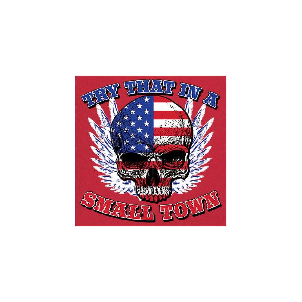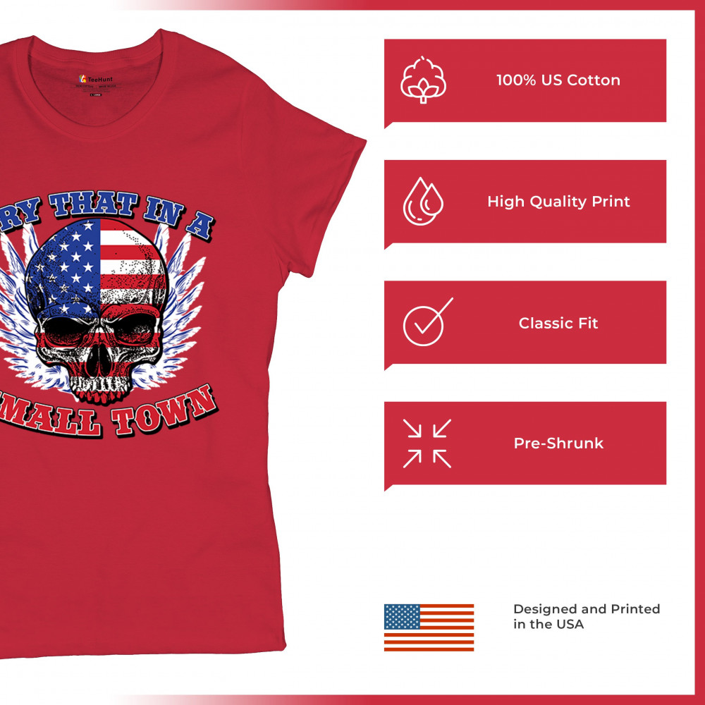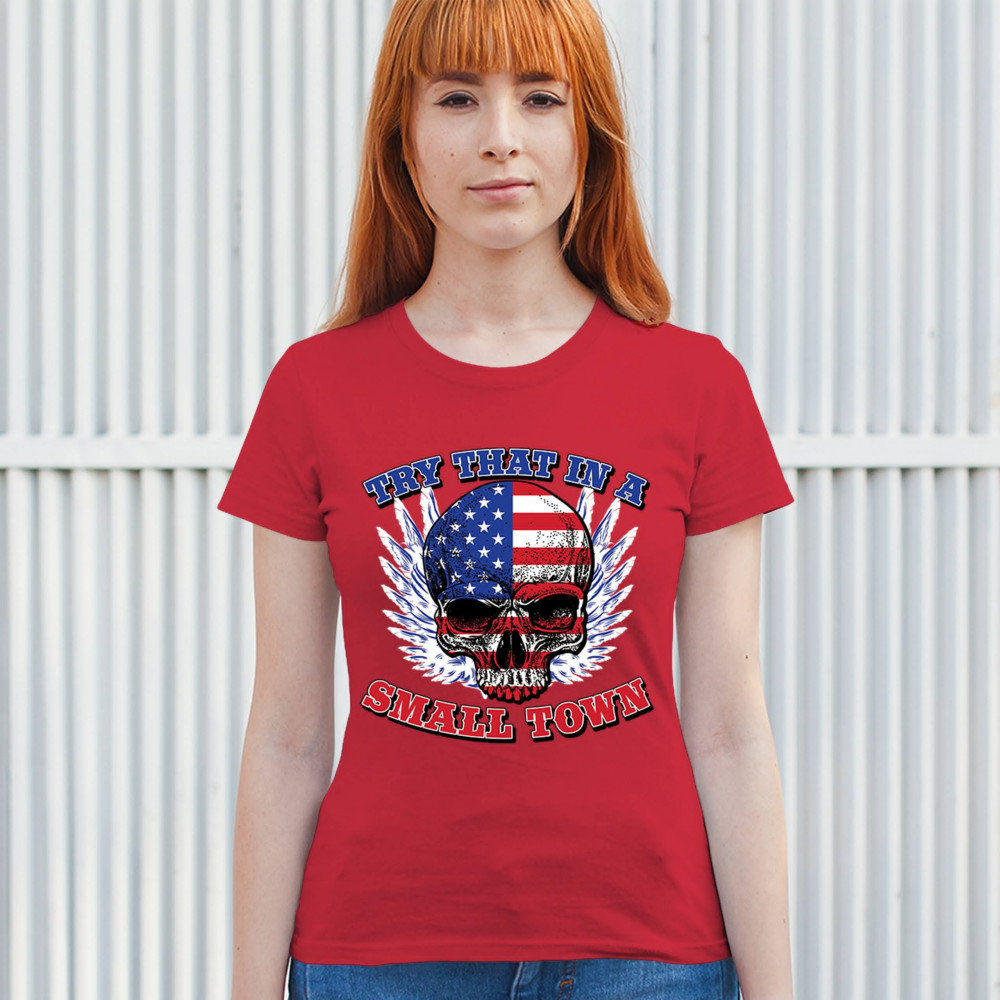 TRY THAT IN A SMALL TOWN t-shirt american flag skull country music women's tee red
