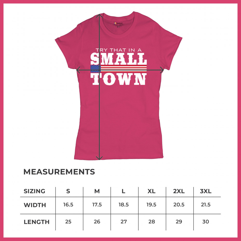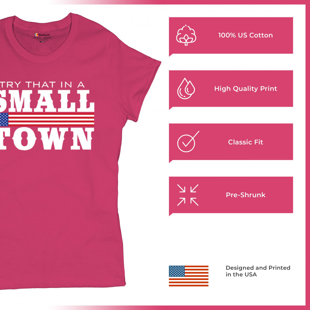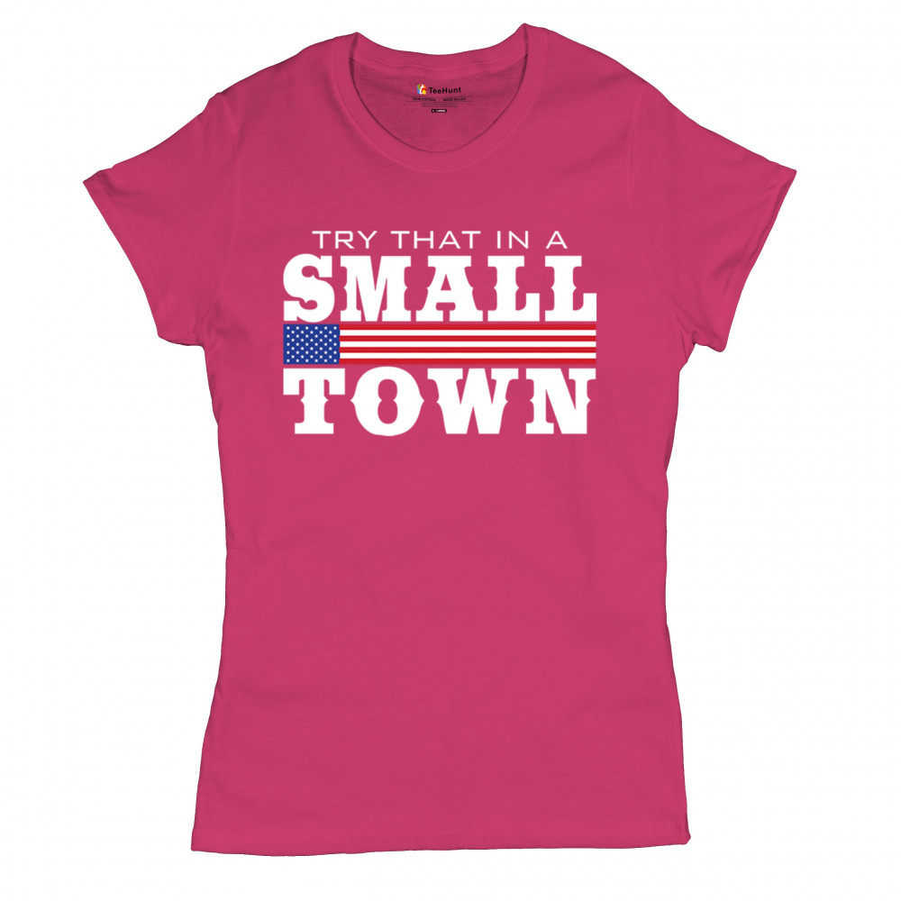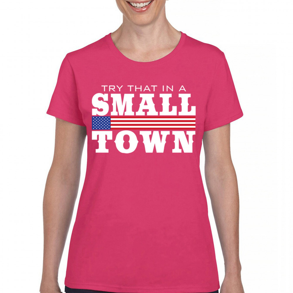 Celebrate small-town pride with our "Try That In A Small Town" design. Perfect for patriotic events, it features a bold American flag graphic.