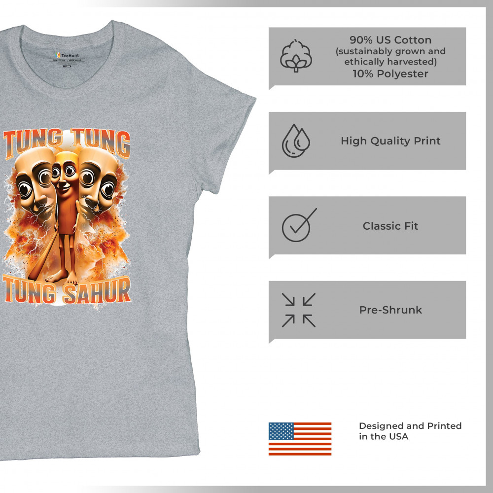Brace yourself for pure meme insanity with the Tung Tung Tung Sahur shirt—a cursed-core fever dream built from TikTok chaos and Gen Z humor. This design blends internet meme culture, ironic fashion, brainrot visuals, and Gen Alpha absurdity. Perfect for those who wear memes, laugh at chaos, and live for viral trends.