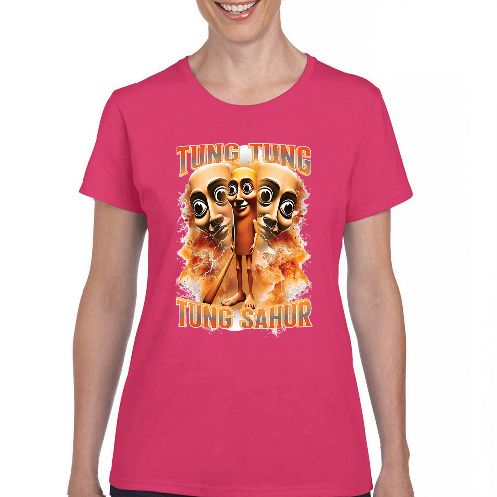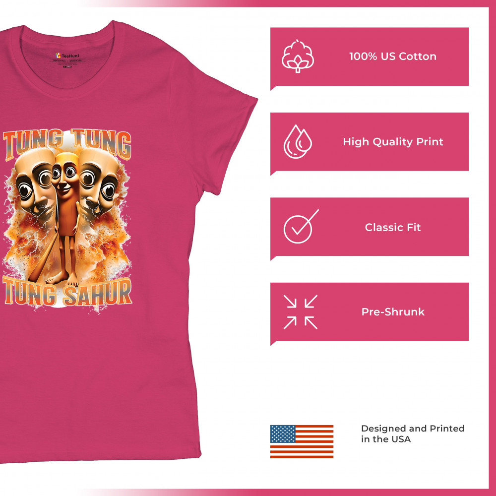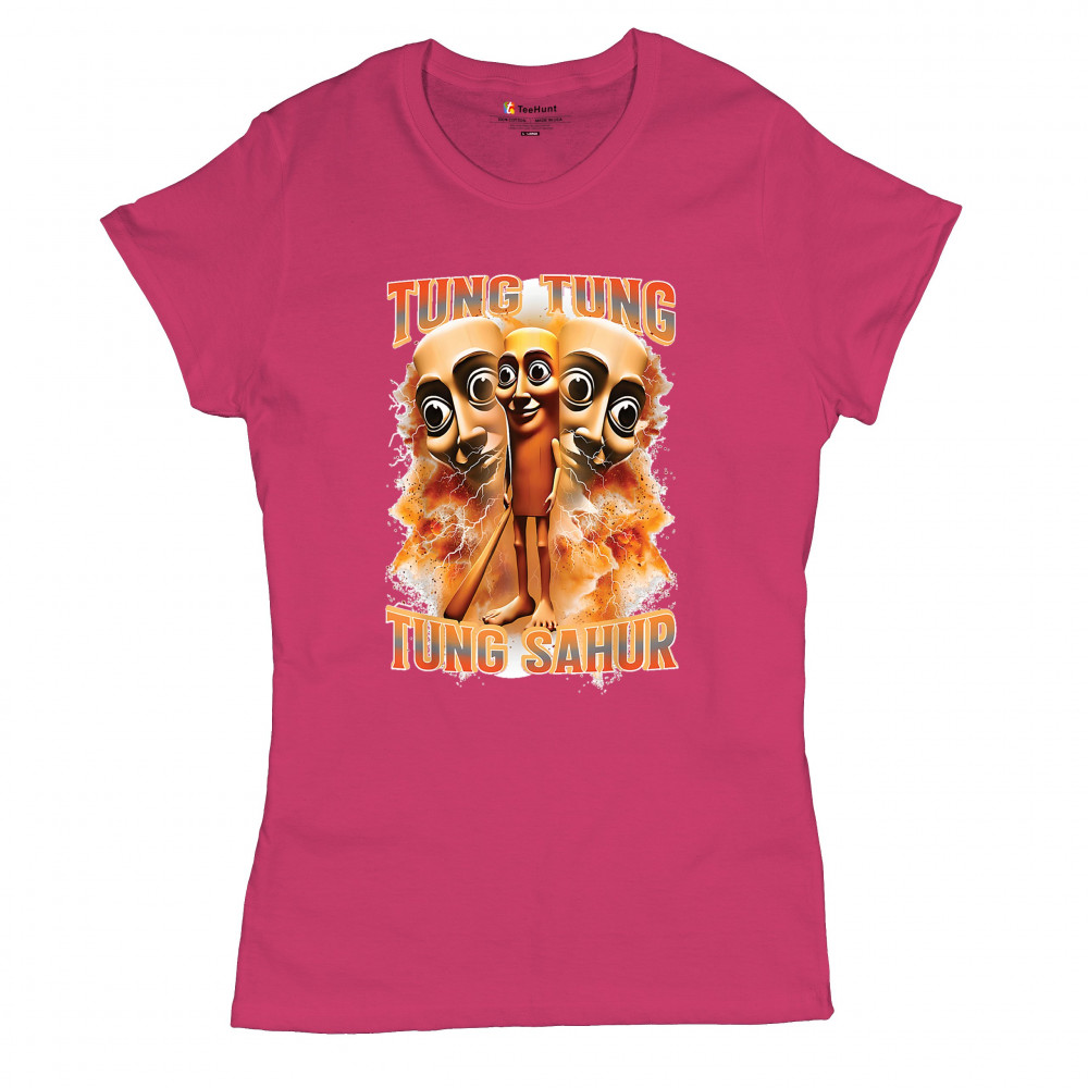 Brace yourself for pure meme insanity with the Tung Tung Tung Sahur shirt—a cursed-core fever dream built from TikTok chaos and Gen Z humor. This design blends internet meme culture, ironic fashion, brainrot visuals, and Gen Alpha absurdity. Perfect for those who wear memes, laugh at chaos, and live for viral trends.