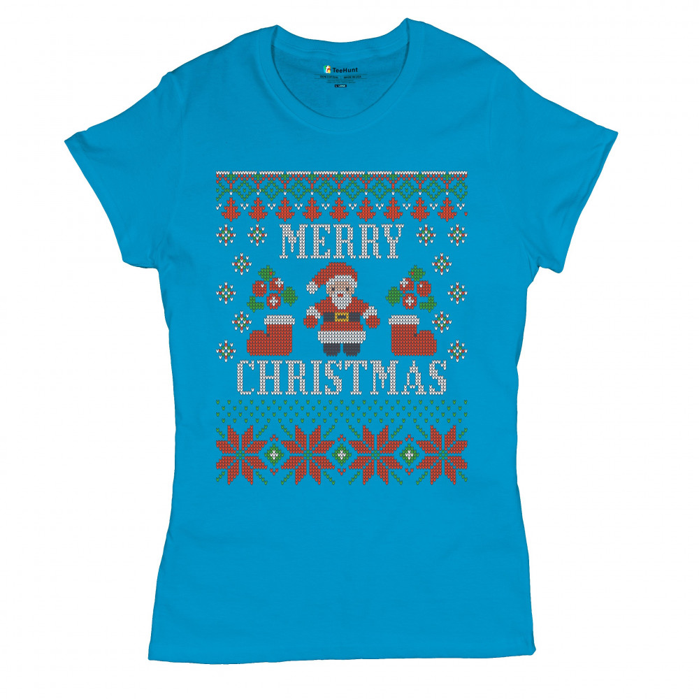 A print saying: "Merry Christmas" and depicting Santa Claus, two Christmas socks, multiple snowflakes and Christmas trees. The print is decorated as an ugly sweater. A great choice for a Christmas eve celebration.