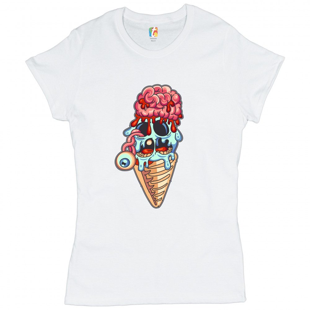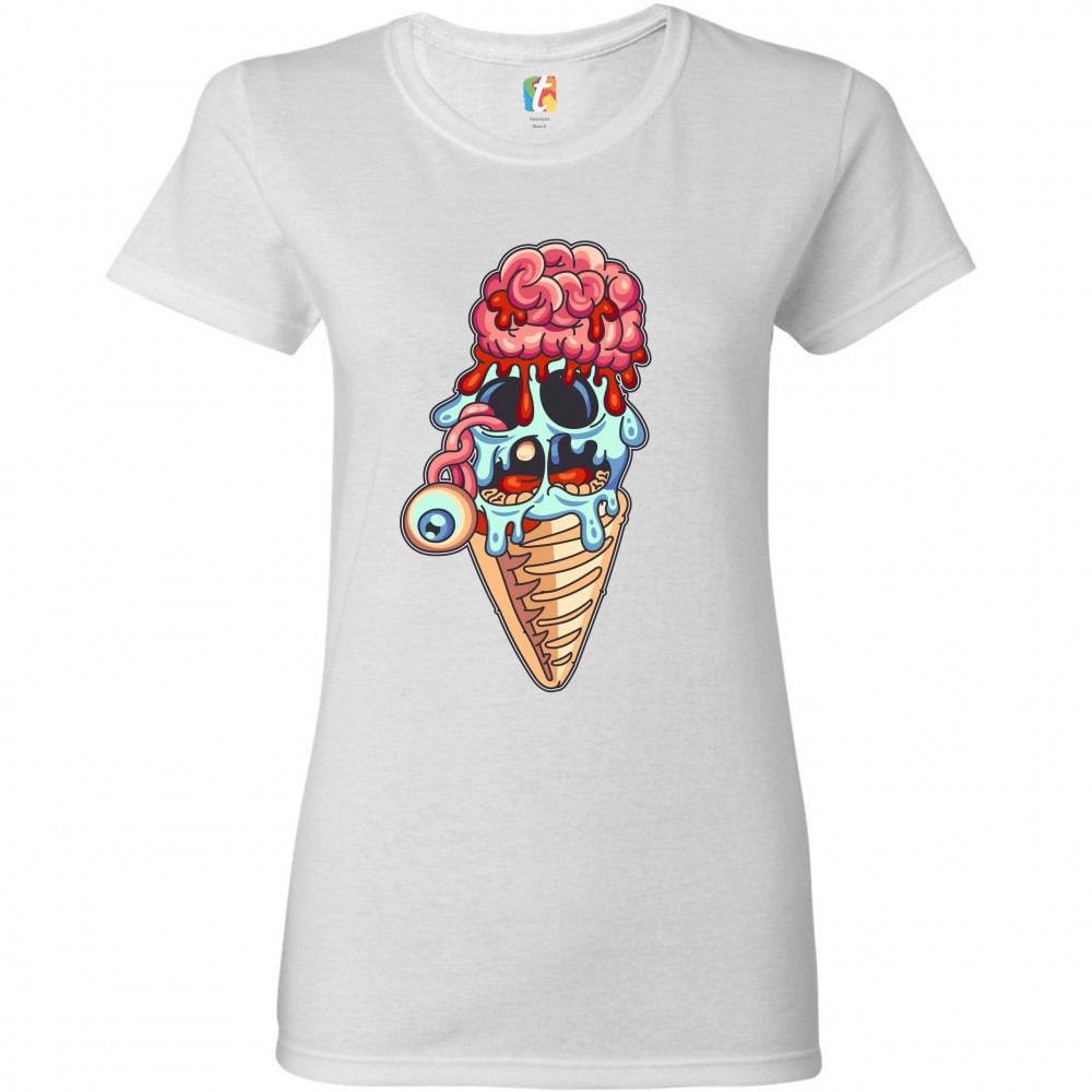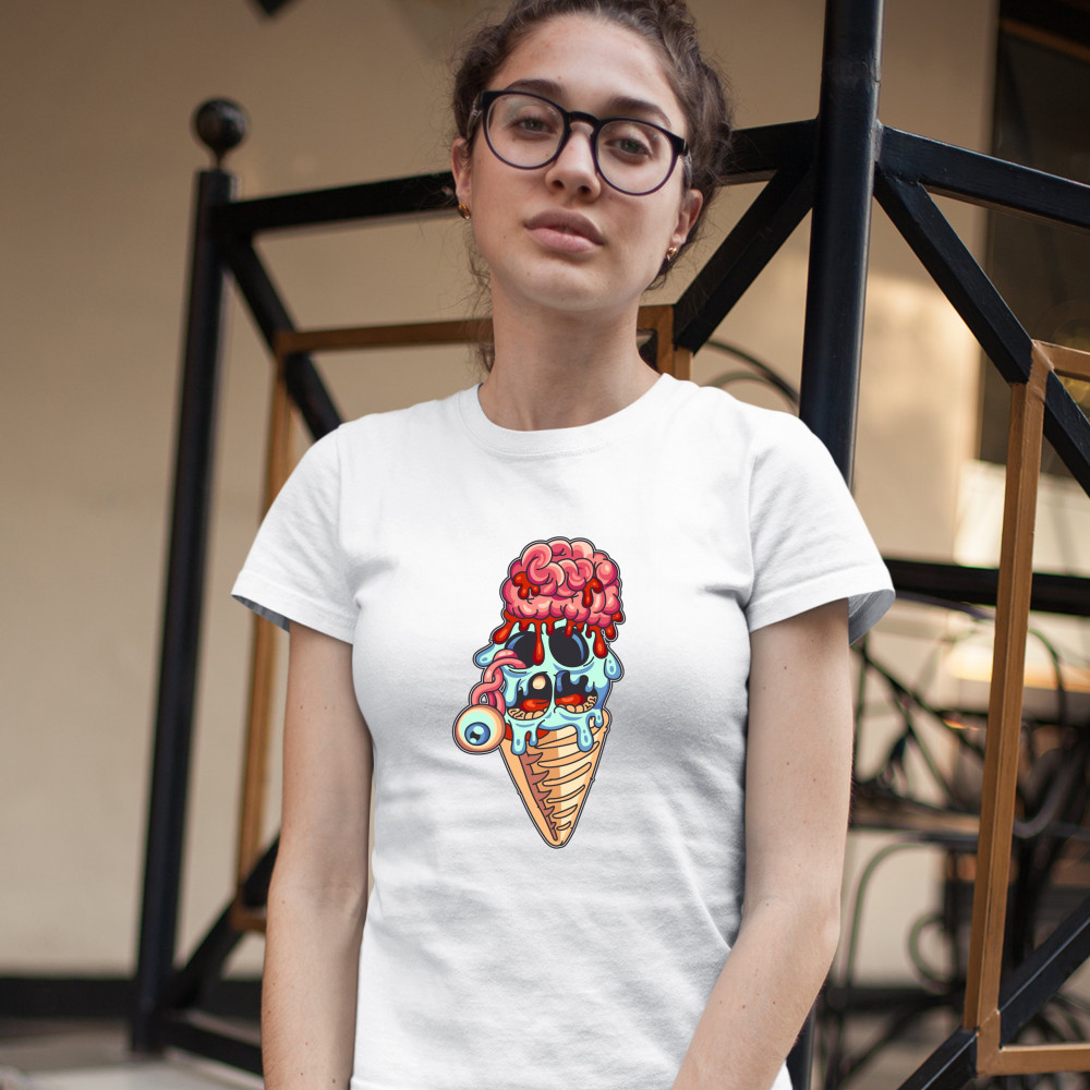 A print featuring an undead ice cream. The ice cream ball looks like a head of a zombie with an eye popping out and hanging and bloodied brains attached on top. A great choice for a person who is into horror movies, haunted houses and freaking people out!