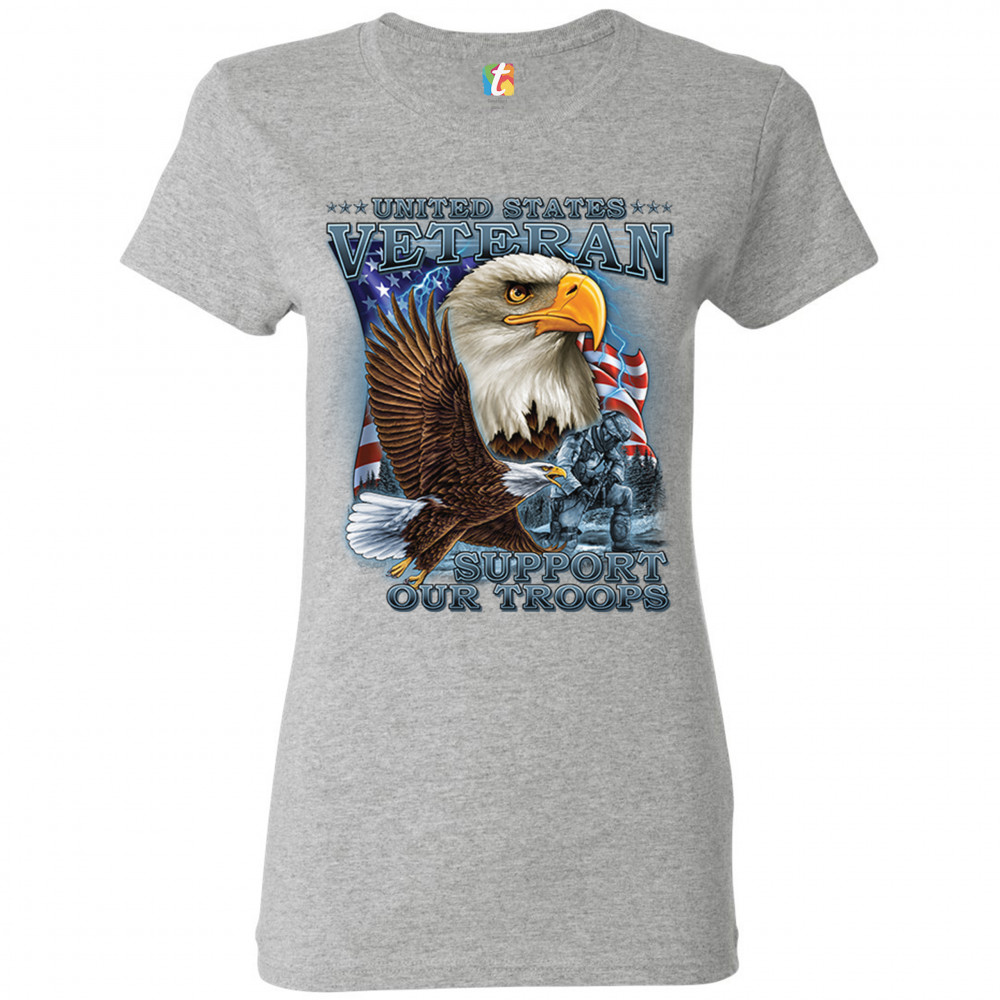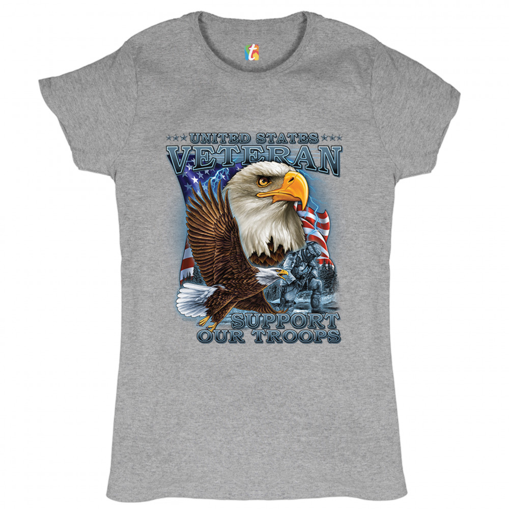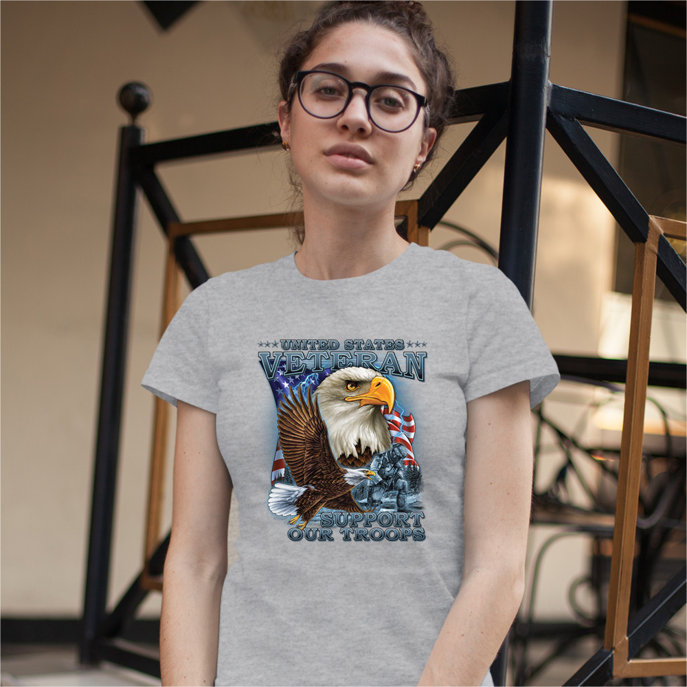 A patriotic print featuring a flying American bald eagle. There is another bald eagle covering most of the American flag in the background. There is a kneeling soldier in the front. The print says: "United States Veteran, Support our Troops". A great choice for a true patriot of the USA