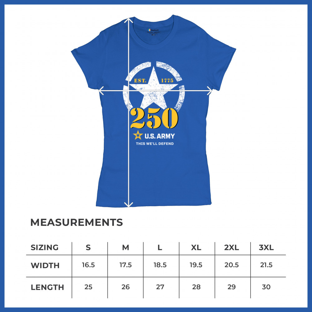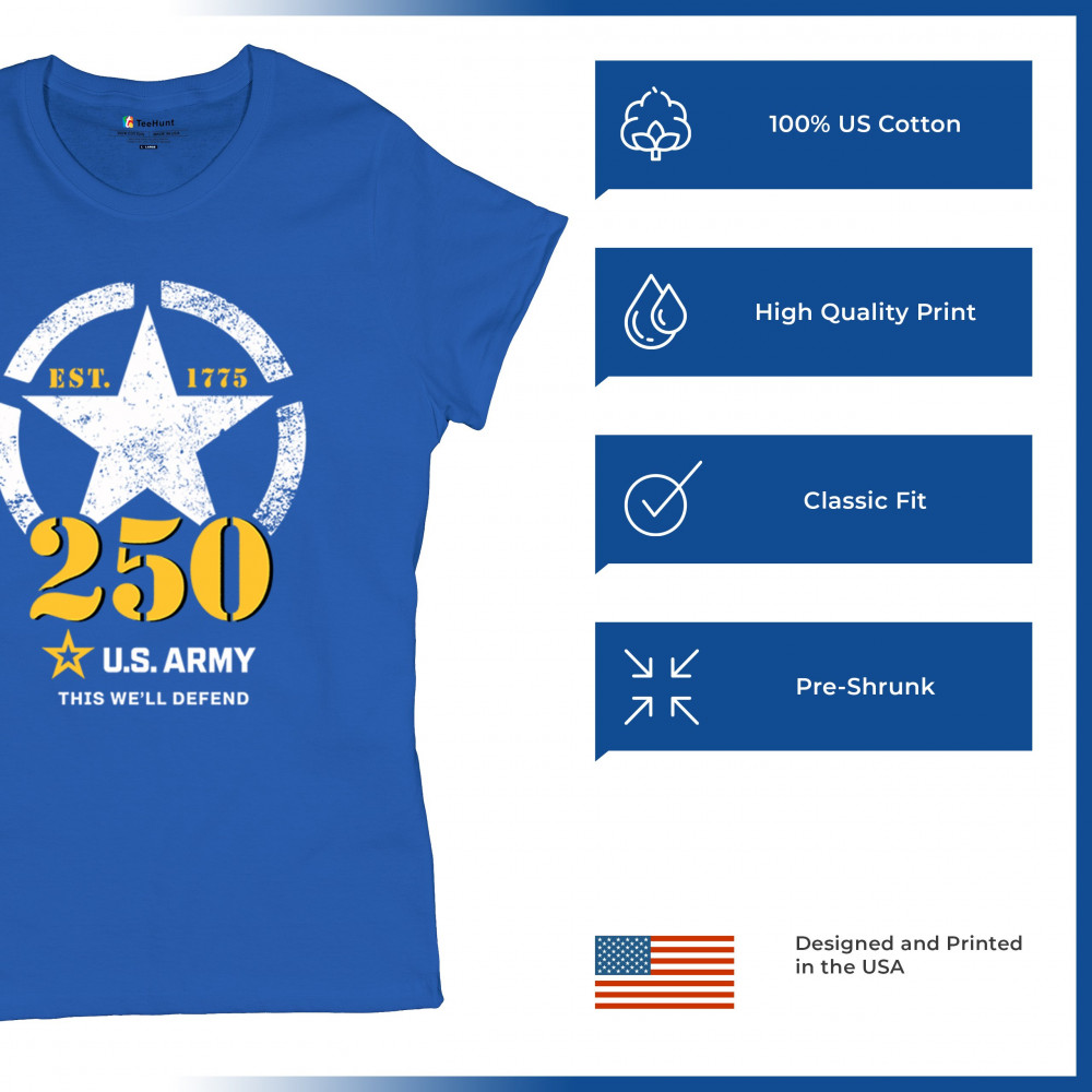 Celebrate 250 years of U.S. Army duty and pride with bold stencil design, EST 1775 mark, and patriotic “This We’ll Defend†motto.