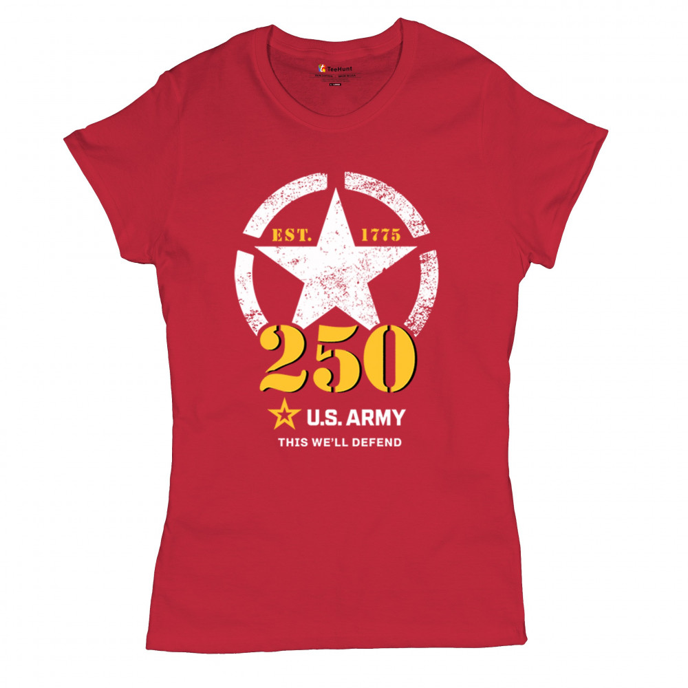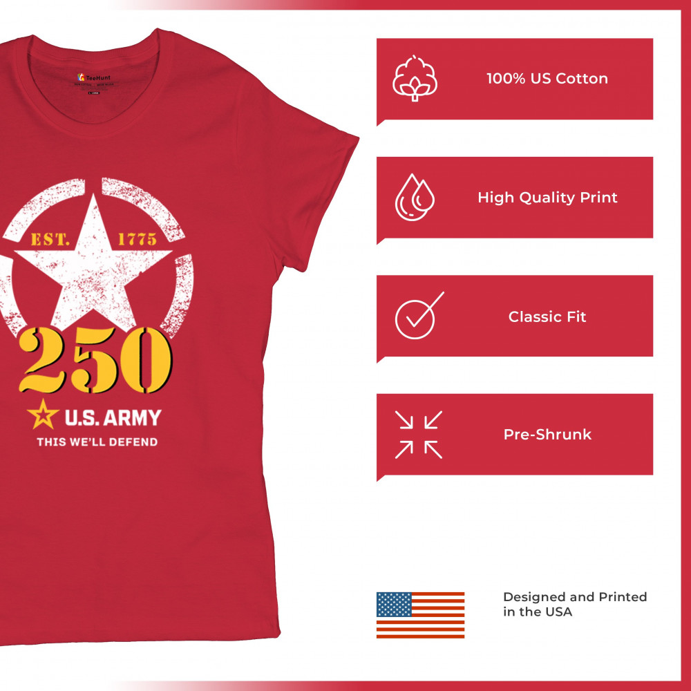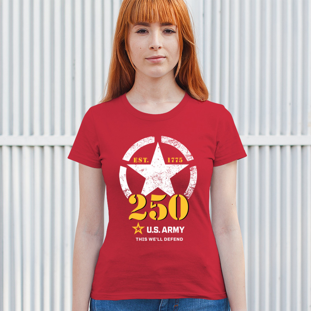 Celebrate 250 years of U.S. Army duty and pride with bold stencil design, EST 1775 mark, and patriotic “This We’ll Defend†motto.