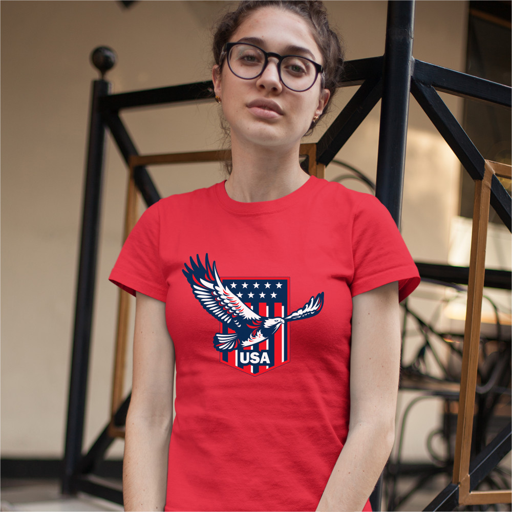 USA BALD EAGLE t-shrit stars and stripes shield 4th of july women's tee red