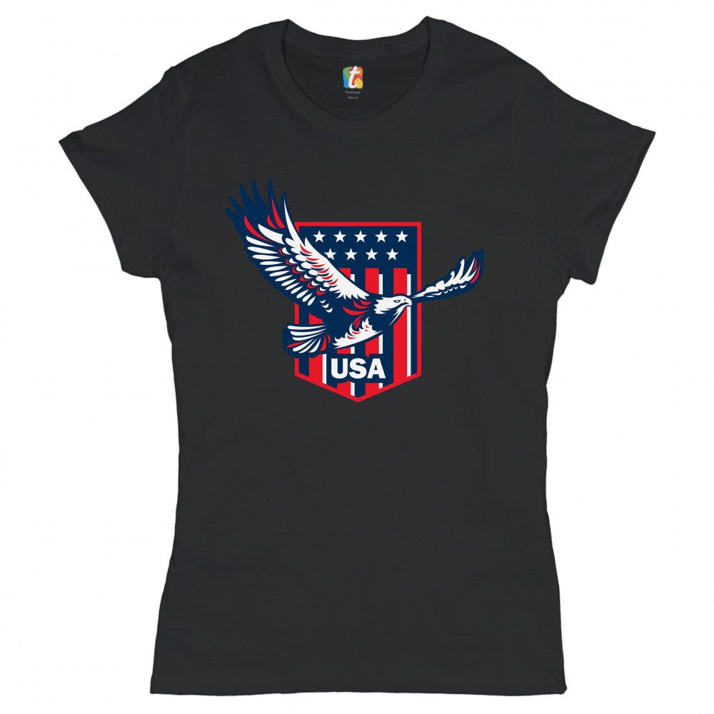 USA BALD EAGLE t-shrit stars and stripes shield 4th of july women's tee black
