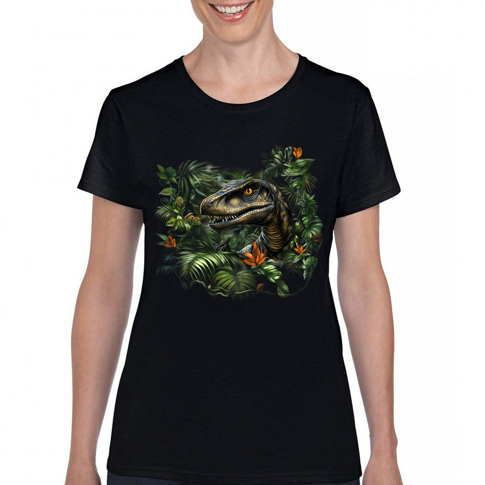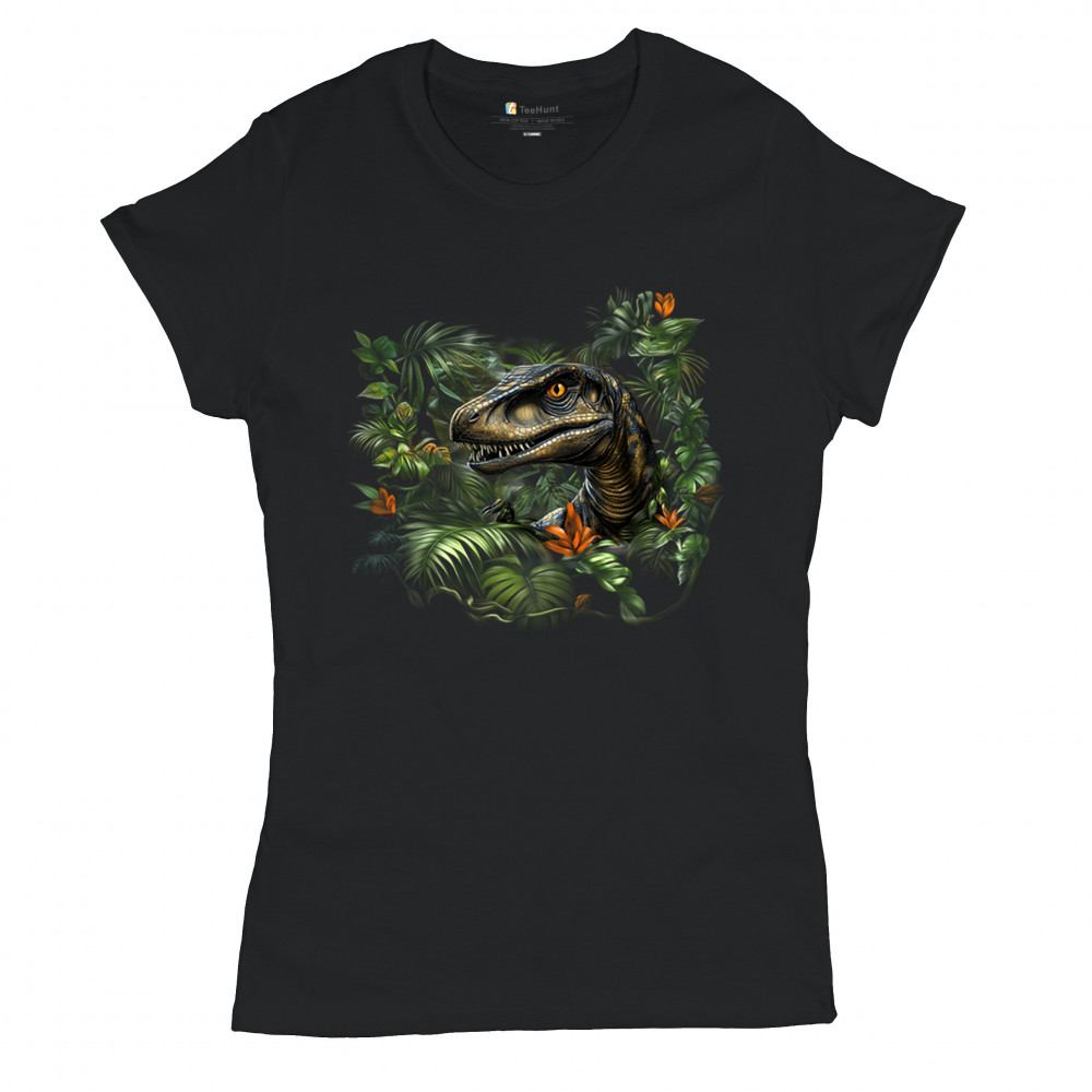 Step into the wild with this striking jungle raptor design. A highly detailed velociraptor peeks from vivid tropical foliage and flowers, perfect for dinosaur lovers, fossil fans, and ancient creature enthusiasts. Whether for Jurassic adventures, museum trips, or themed events, this design unleashes untamed prehistoric energy.