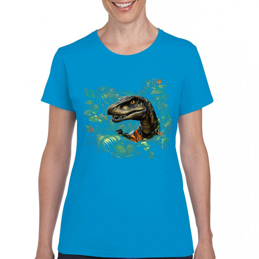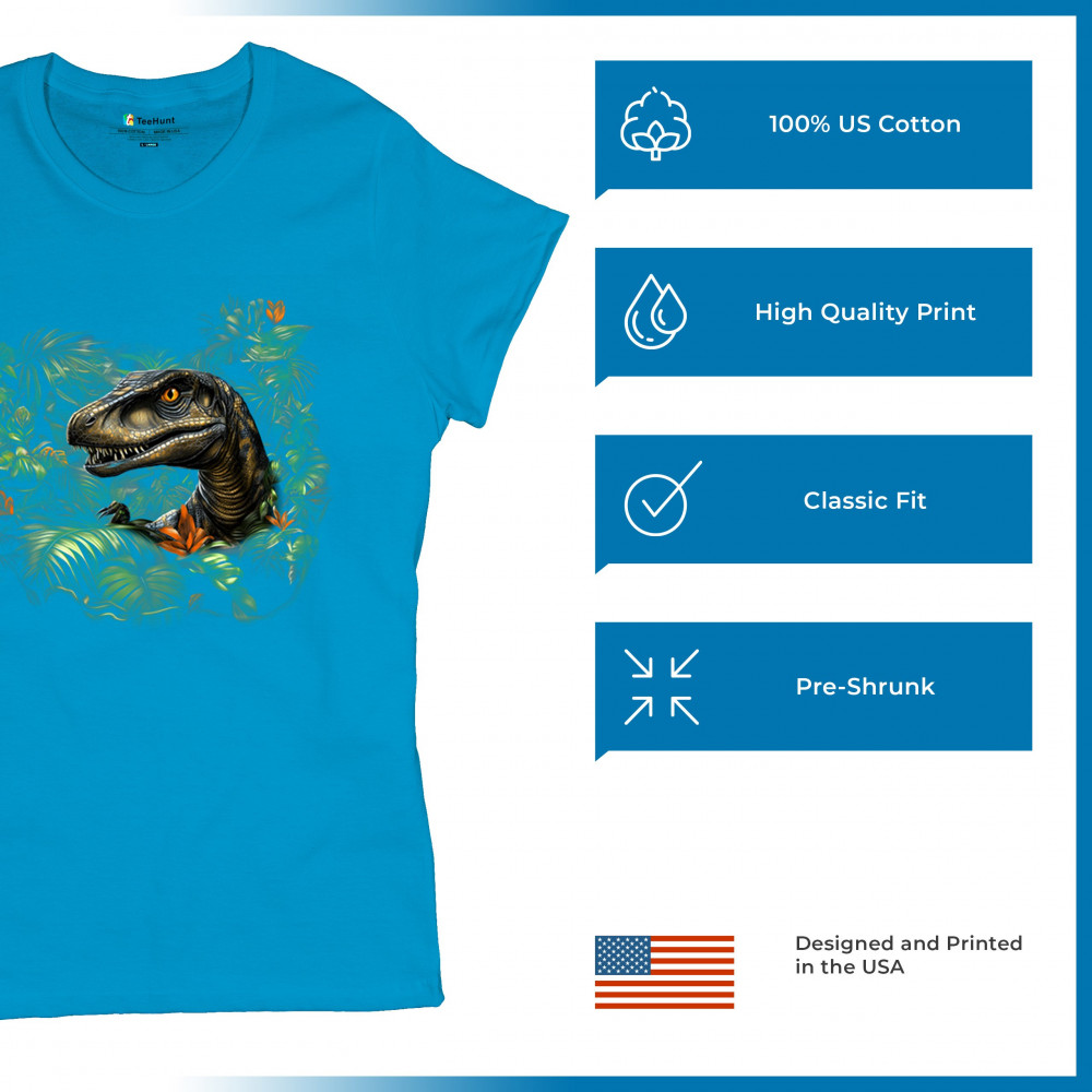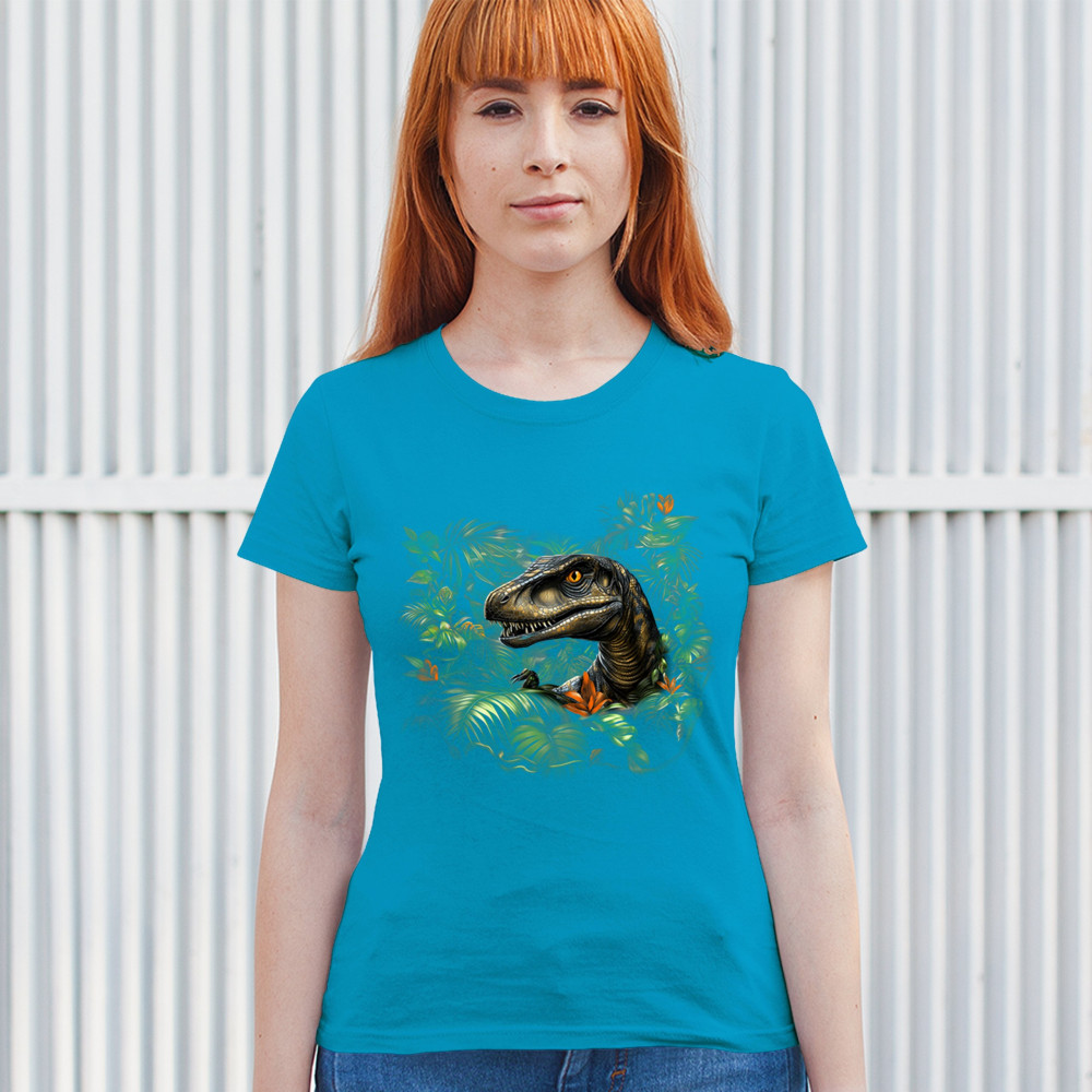 Step into the wild with this striking jungle raptor design. A highly detailed velociraptor peeks from vivid tropical foliage and flowers, perfect for dinosaur lovers, fossil fans, and ancient creature enthusiasts. Whether for Jurassic adventures, museum trips, or themed events, this design unleashes untamed prehistoric energy.