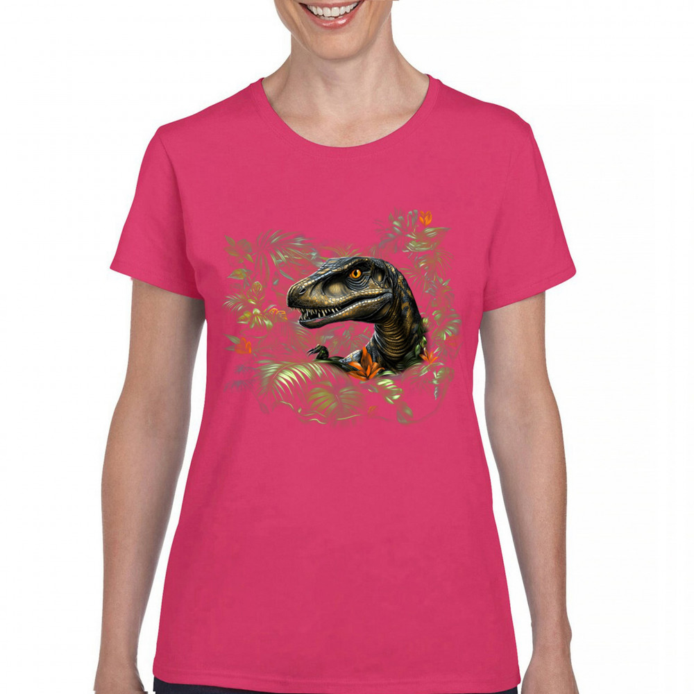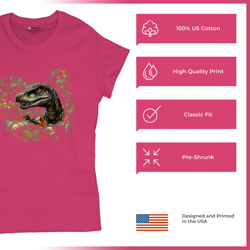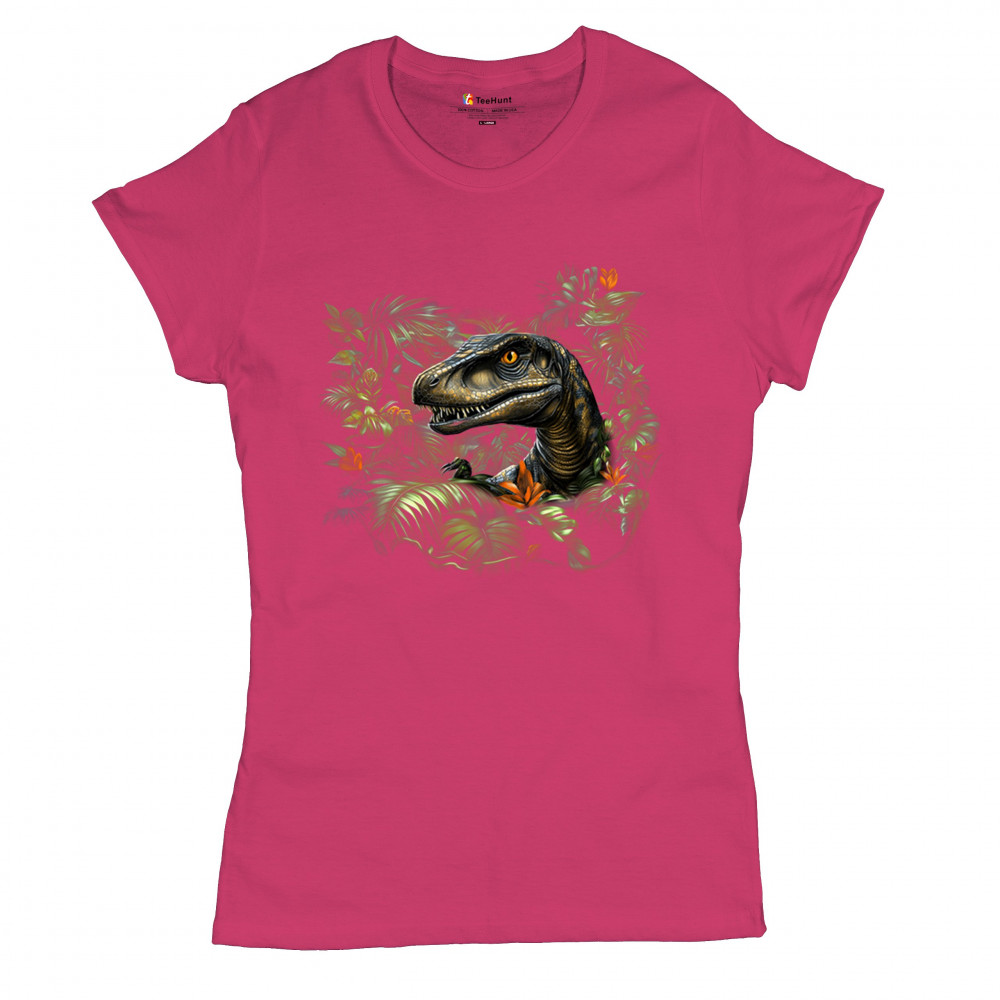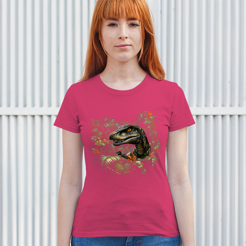 Step into the wild with this striking jungle raptor design. A highly detailed velociraptor peeks from vivid tropical foliage and flowers, perfect for dinosaur lovers, fossil fans, and ancient creature enthusiasts. Whether for Jurassic adventures, museum trips, or themed events, this design unleashes untamed prehistoric energy.