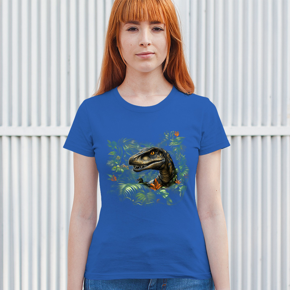 Step into the wild with this striking jungle raptor design. A highly detailed velociraptor peeks from vivid tropical foliage and flowers, perfect for dinosaur lovers, fossil fans, and ancient creature enthusiasts. Whether for Jurassic adventures, museum trips, or themed events, this design unleashes untamed prehistoric energy.