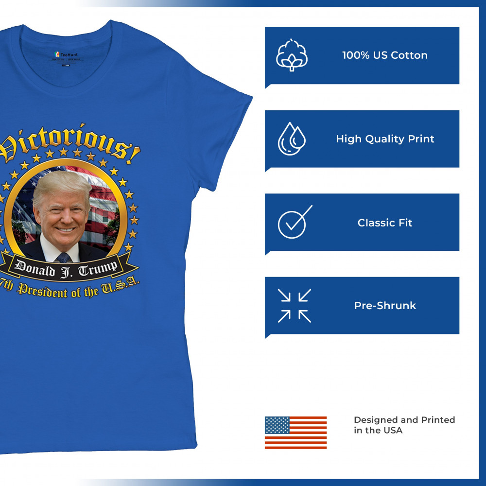 The "Victorious" design captures the spirit of Donald J. Trump’s victory as the 47th President, embodying the pride and patriotism of true American supporters. With elements of the American flag and an inspiring message, it’s a perfect symbol for Republicans, conservatives, and America First advocates. Celebrate the Red Wave and stand for a strong, united nation. Perfect for showing support at rallies, gatherings, or casual wear.