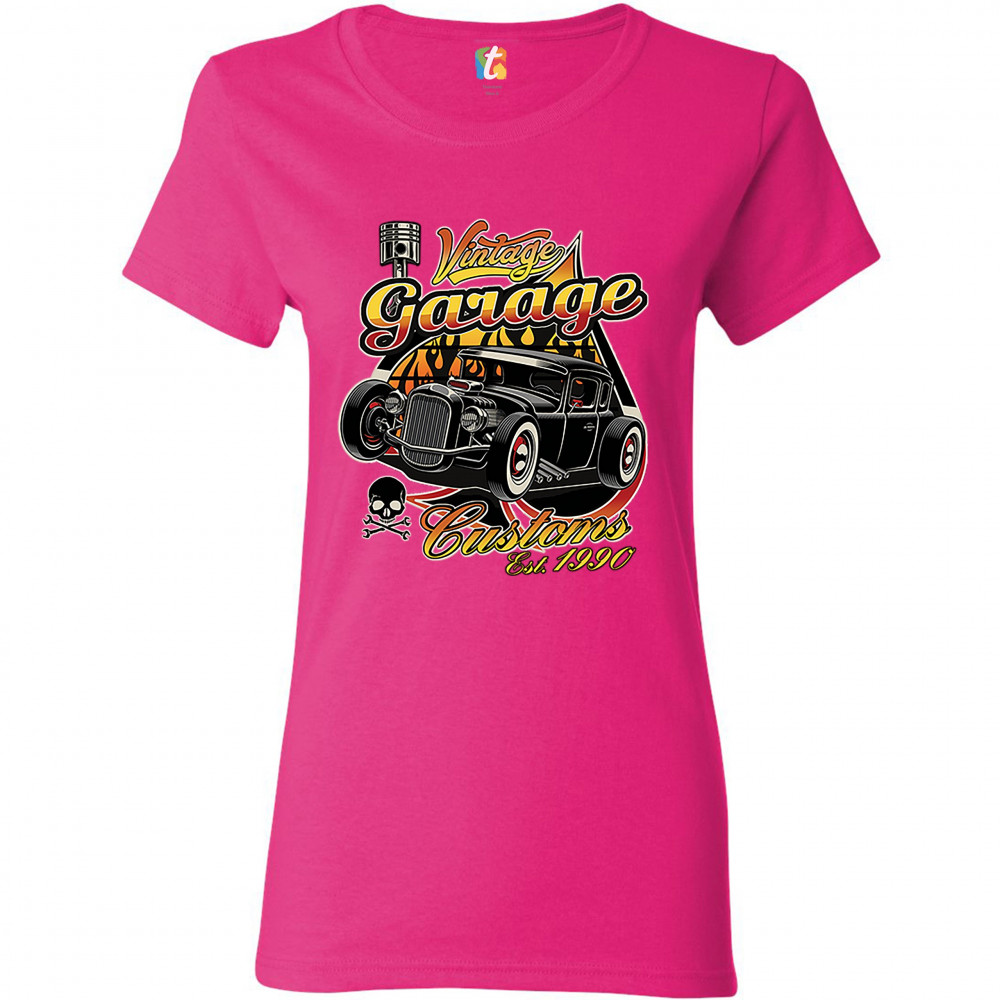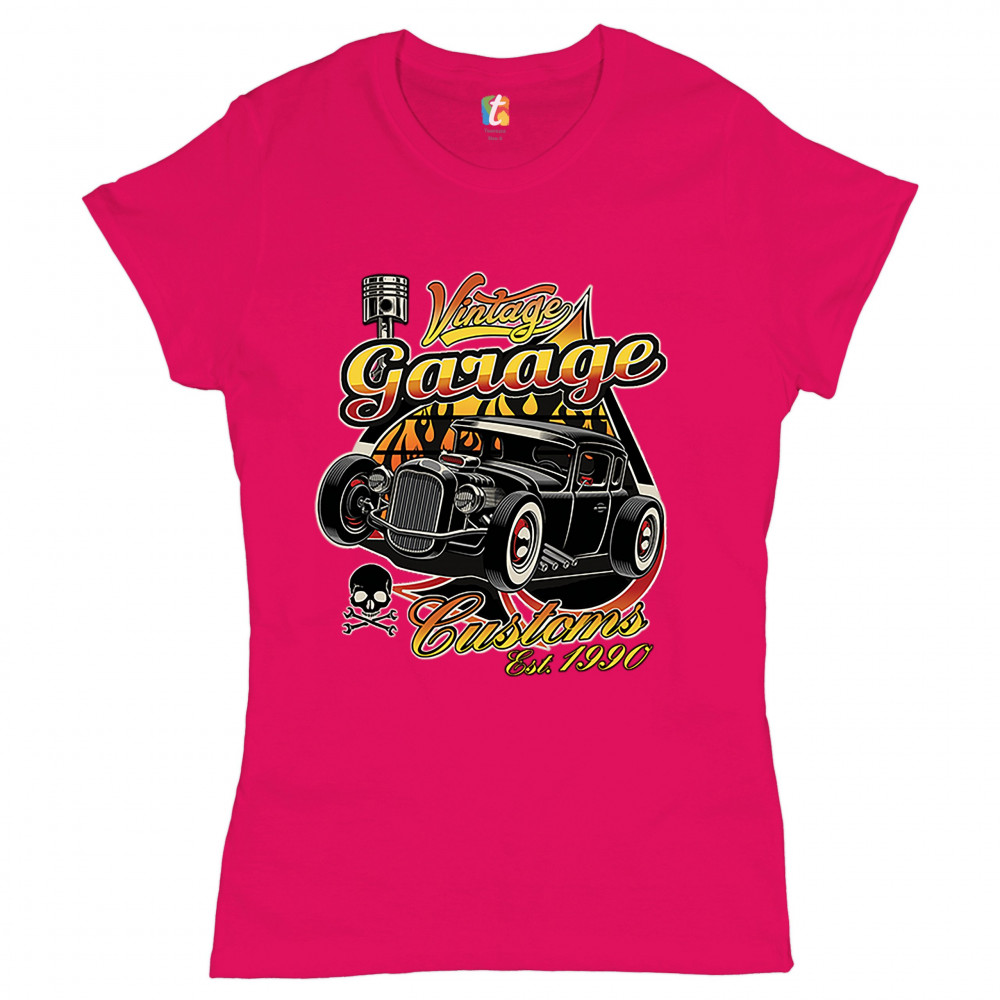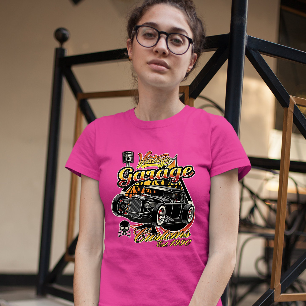 A print featuring a lowrider hot rod, a small skull with crossed wrenches instead of bones, a piston and an ace of spades in the background. The orint says: "Vintage Garage Customs Est. 1990". A great choice for a fan of customized American classic cars a