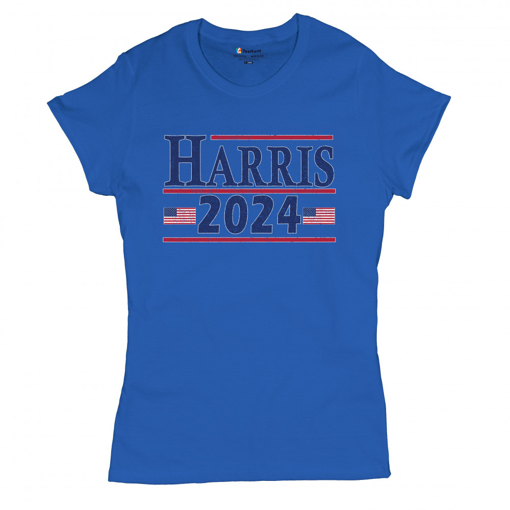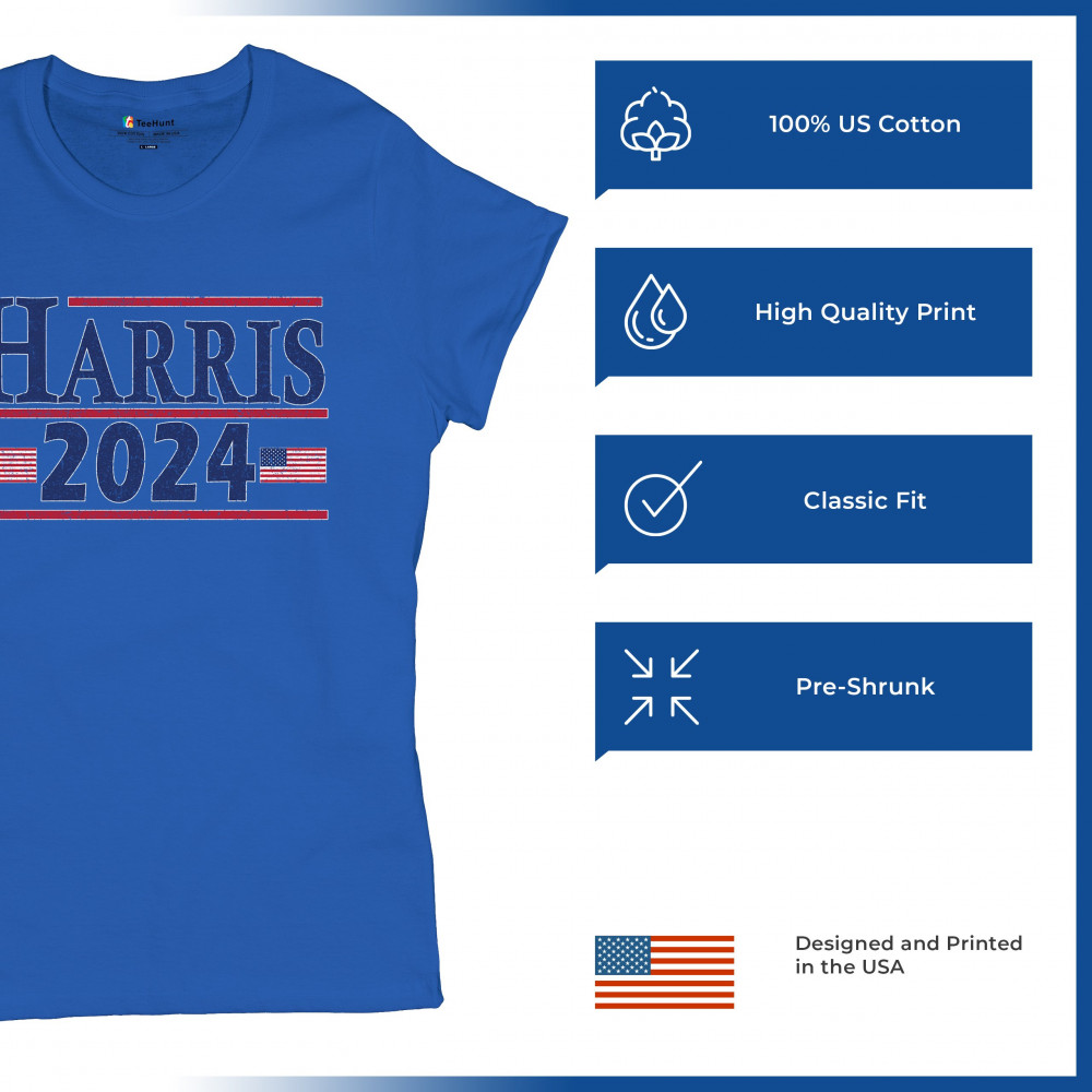 Show your support for Kamala Harris with this bold "Harris 2024" t-shirt, featuring American flags. Perfect for rallies and events. Join the movement today!