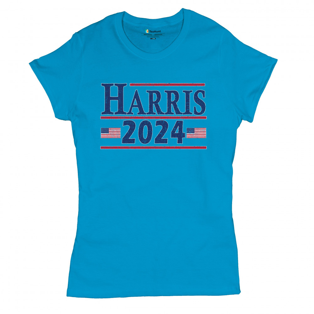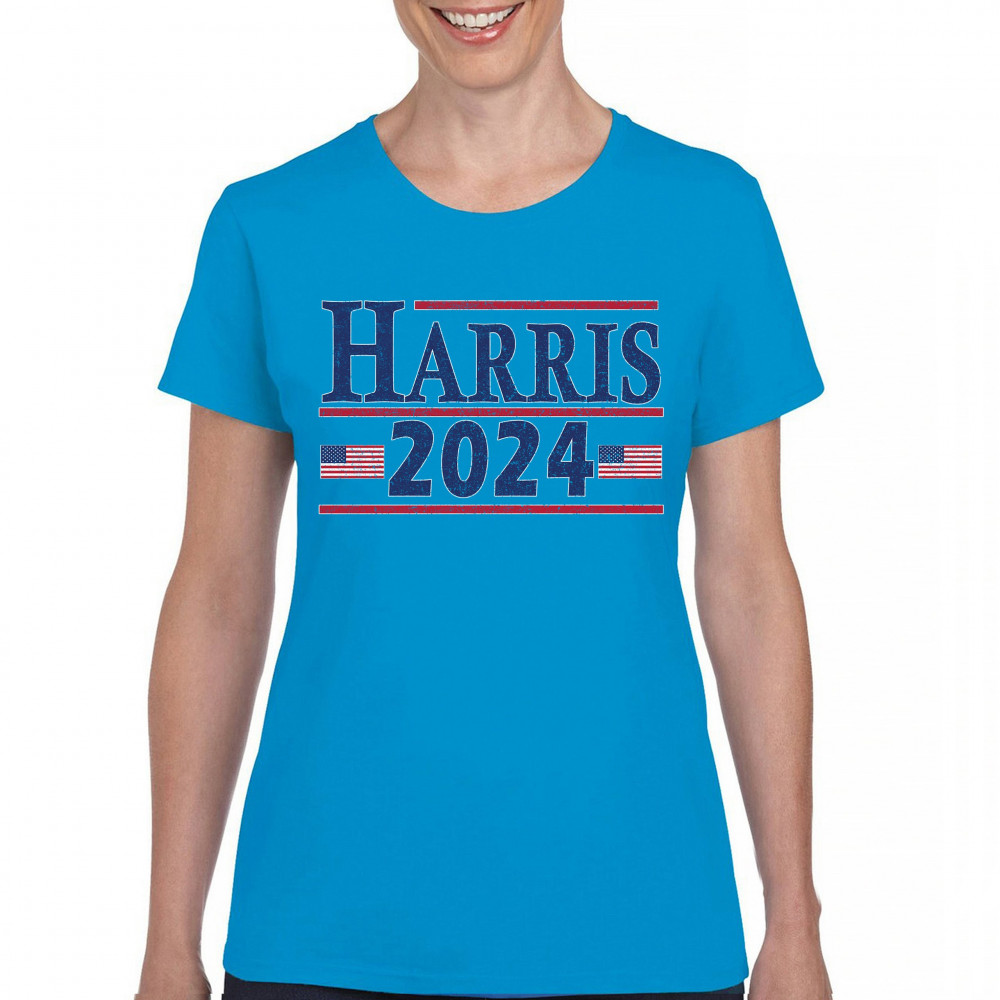 Show your support for Kamala Harris with this bold "Harris 2024" t-shirt, featuring American flags. Perfect for rallies and events. Join the movement today!