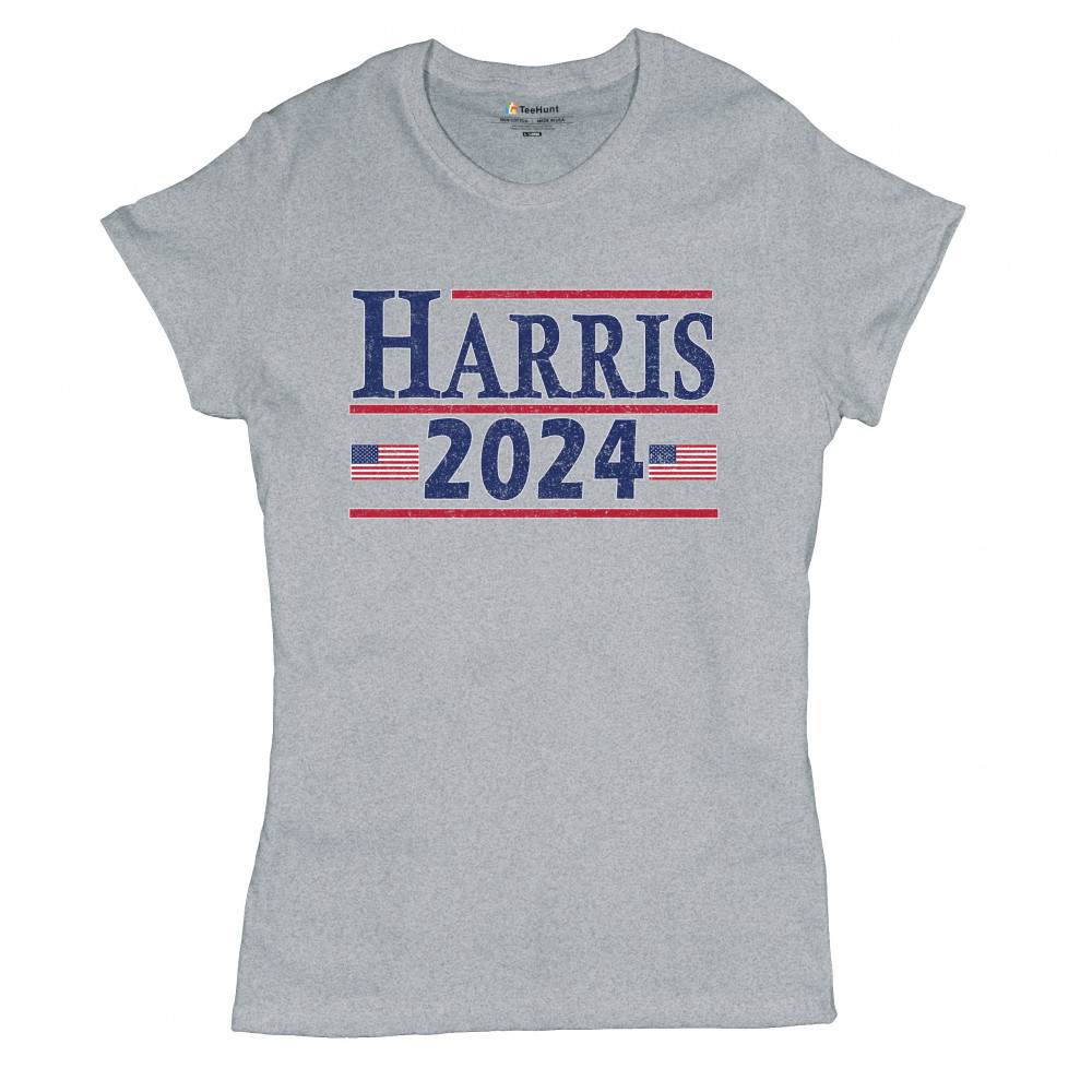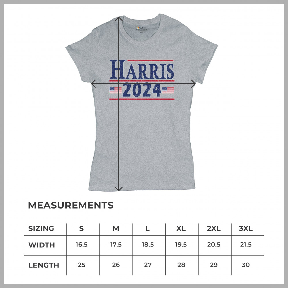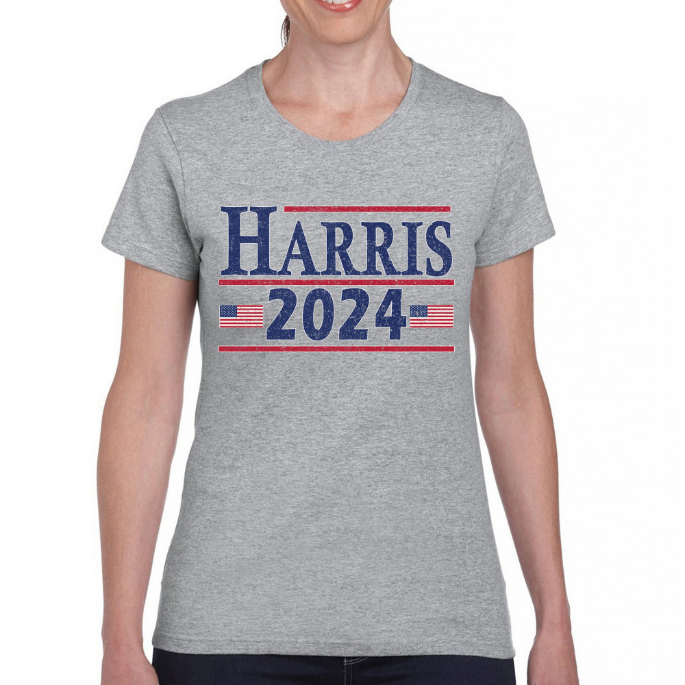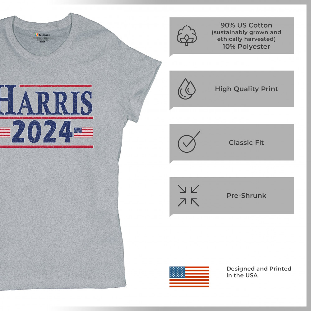 Show your support for Kamala Harris with this bold "Harris 2024" t-shirt, featuring American flags. Perfect for rallies and events. Join the movement today!