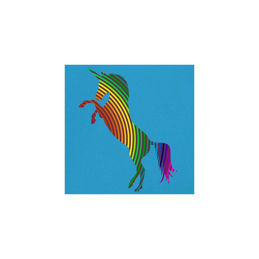 The print depicts a strong rearing unicorn. The unicorn is painted in vivid rainbow-stripe colors. This can symbolize a strong spirit of the sexual and gender minority.