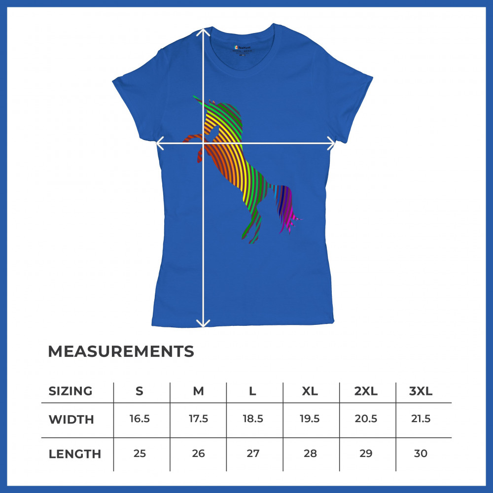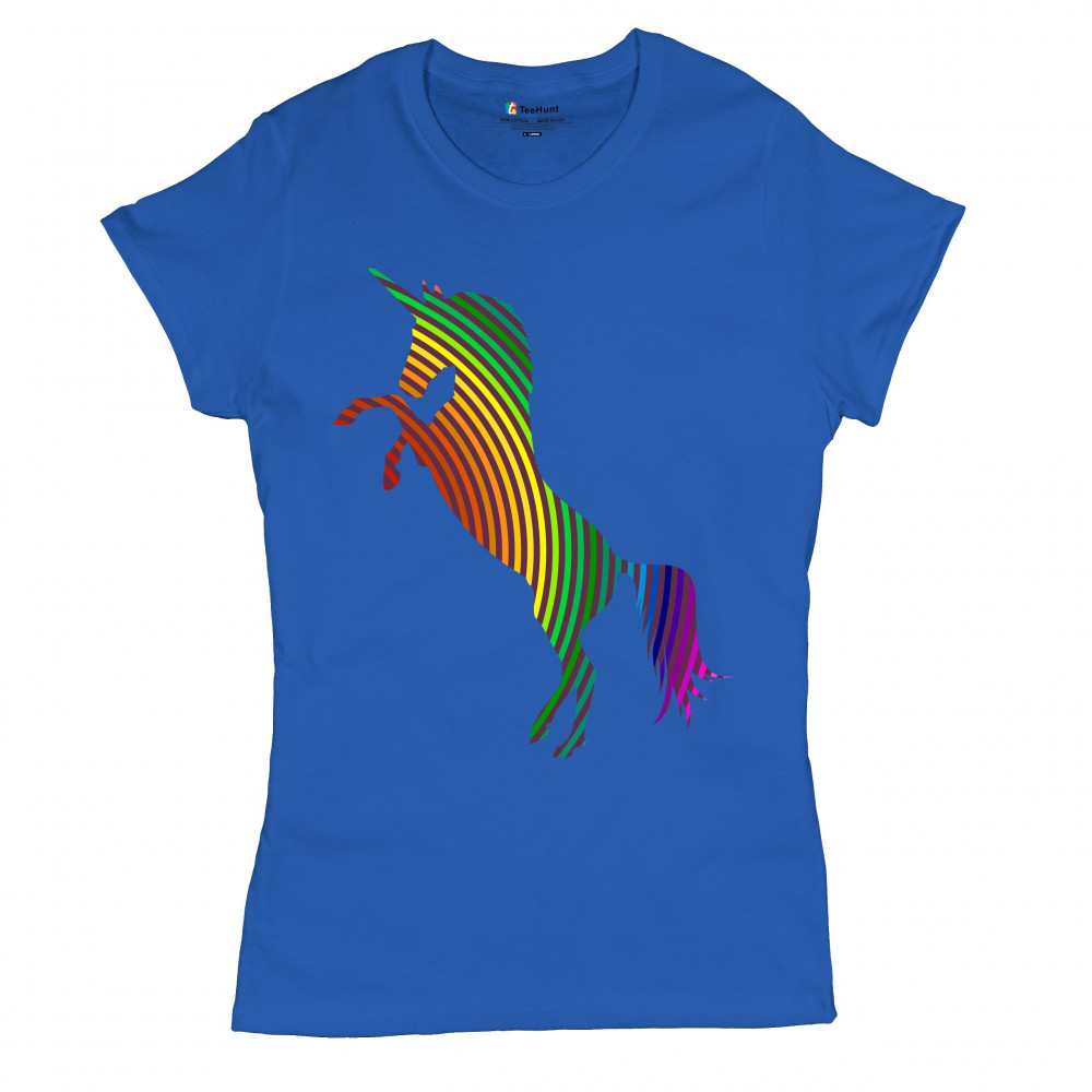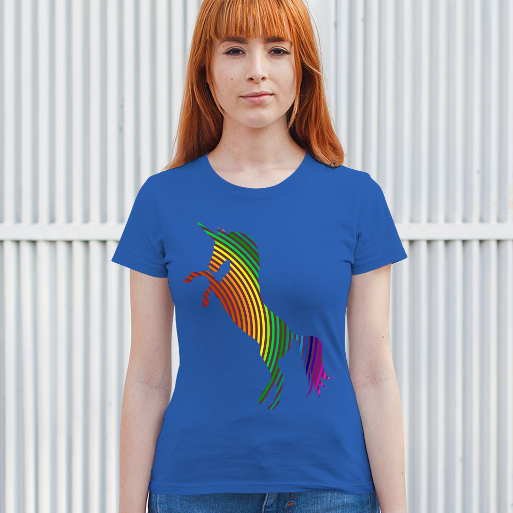 The print depicts a strong rearing unicorn. The unicorn is painted in vivid rainbow-stripe colors. This can symbolize a strong spirit of the sexual and gender minority.