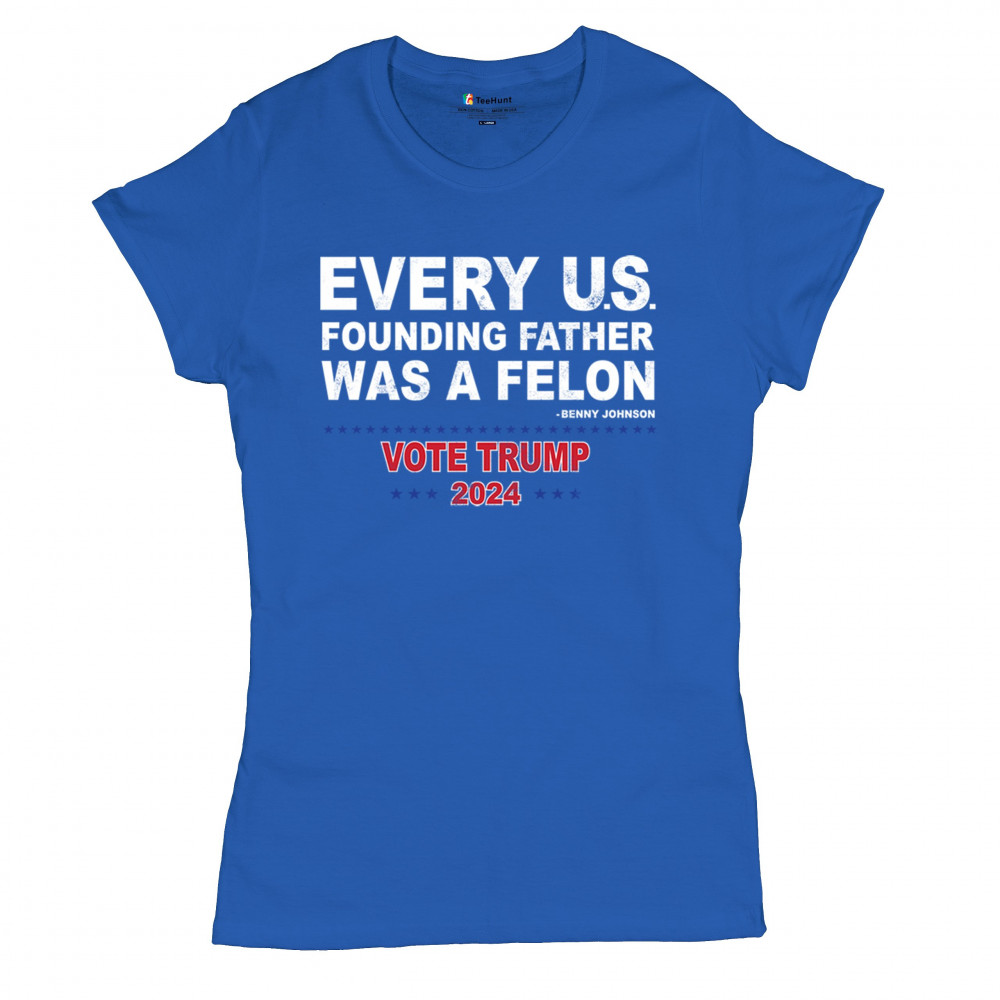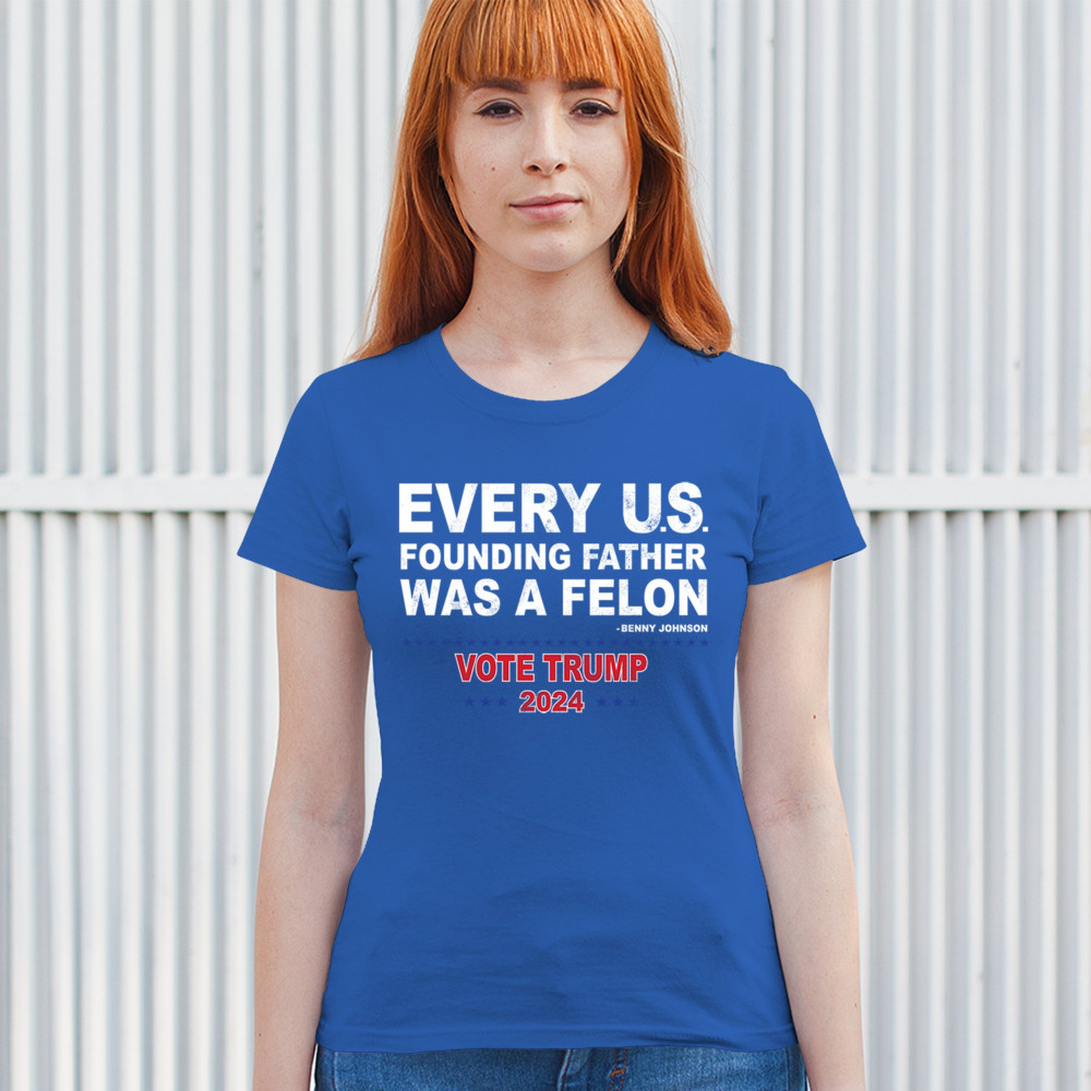 Show your support for Trump 2024 with a bold design quoting "Every U.S. founding father was a felon." Stand against political attacks and support an America-first vision.