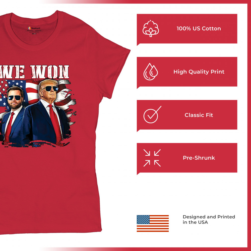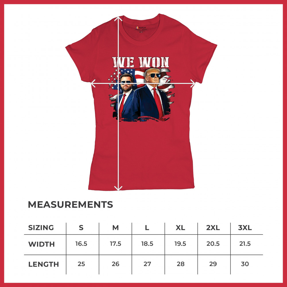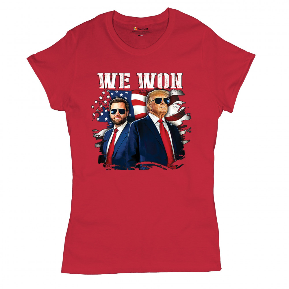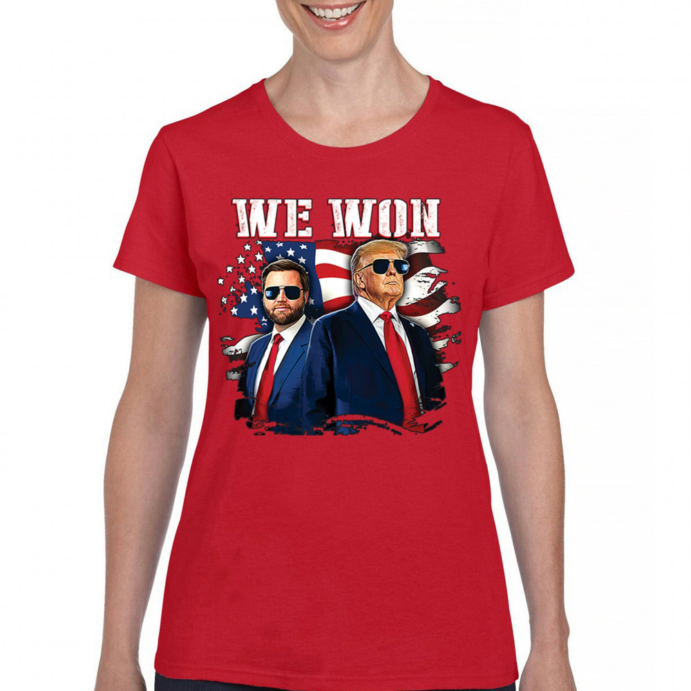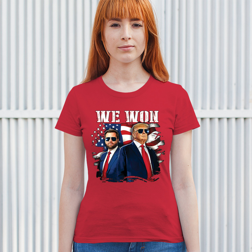 Celebrate Republican victory with this bold "We Won" design featuring Trump and patriotic flair—perfect for rallies, events, and patriotic pride.
