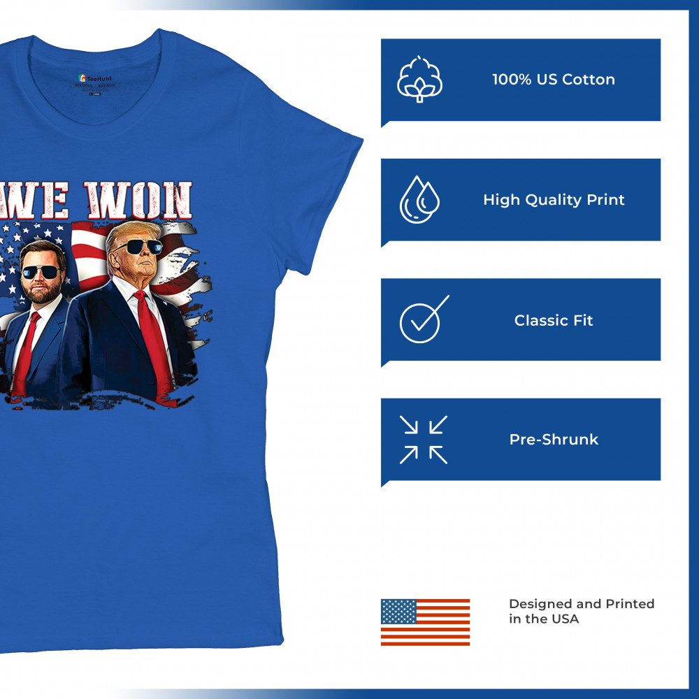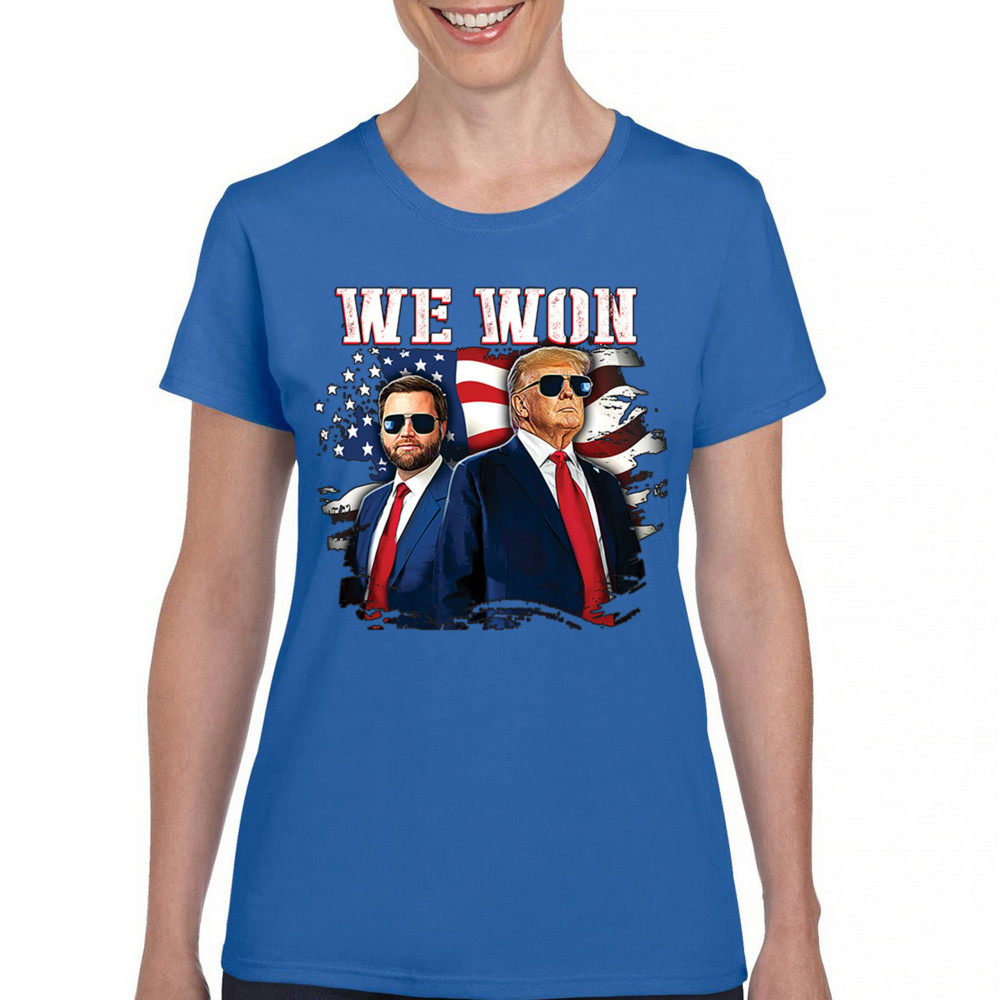 Celebrate Republican victory with this bold "We Won" design featuring Trump and patriotic flair—perfect for rallies, events, and patriotic pride.