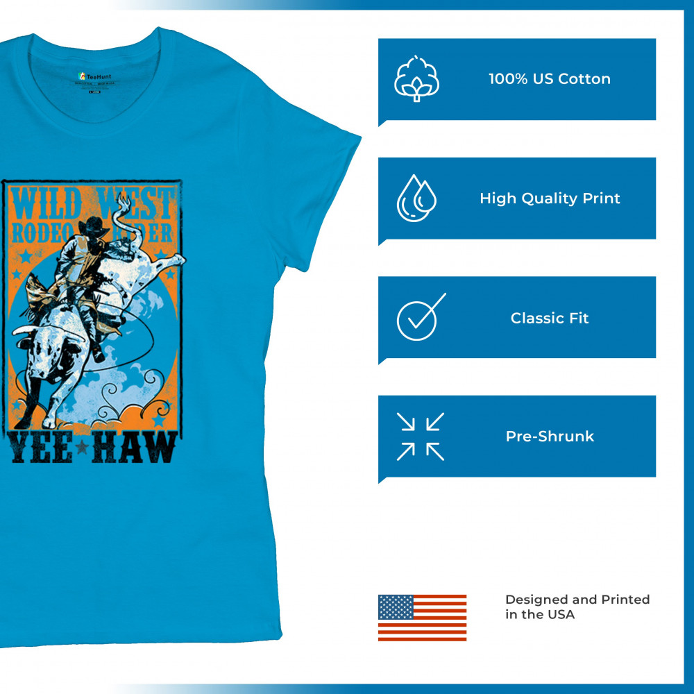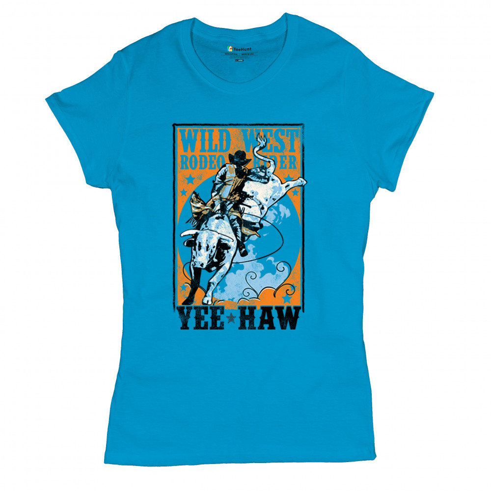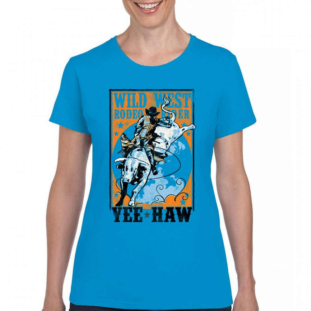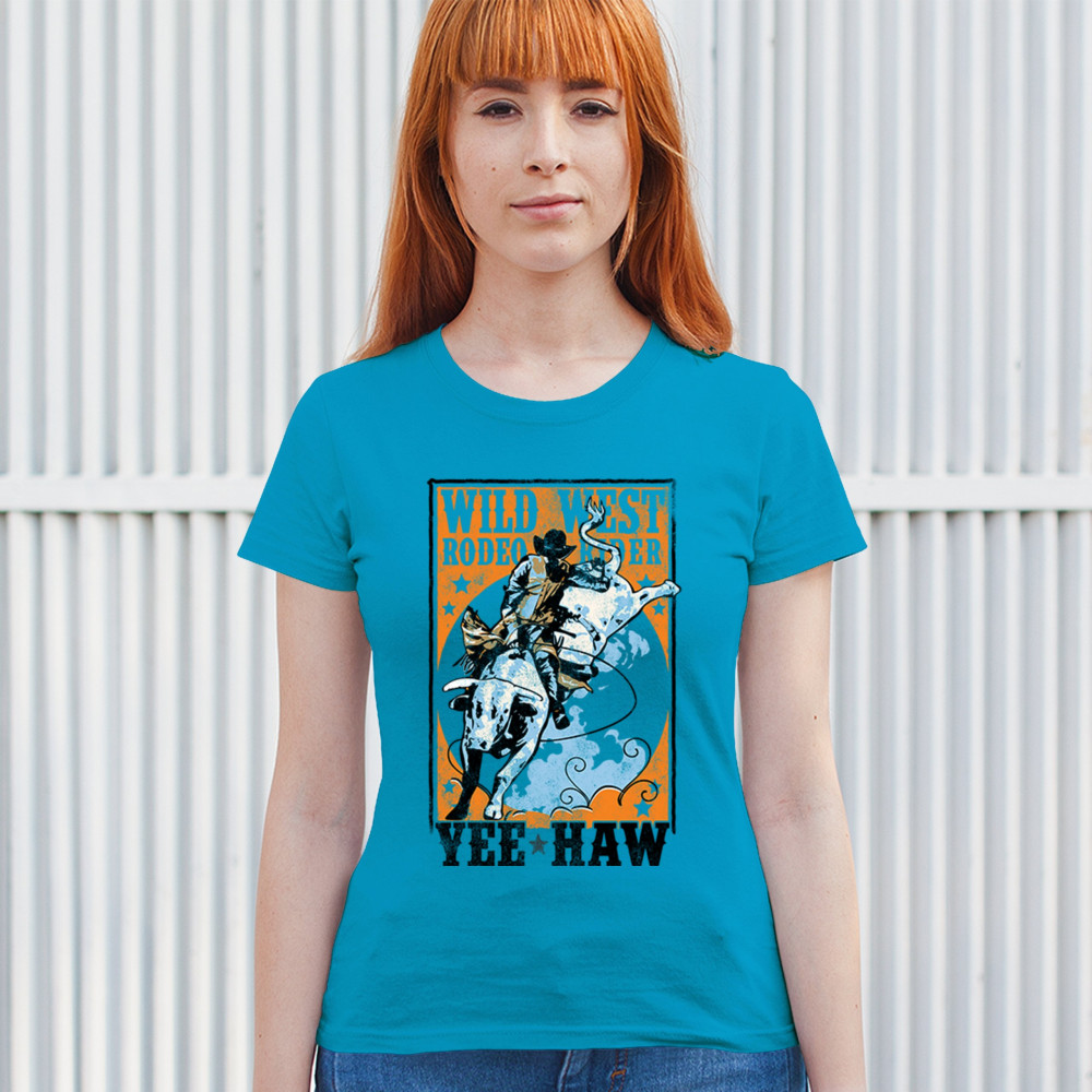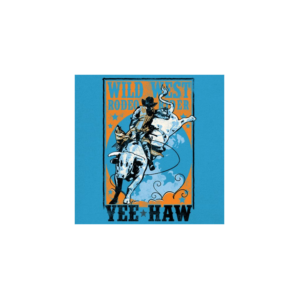 Bold cowboy bull riding design with orange backdrop, perfect for rodeo fans, western events, and country festivals.