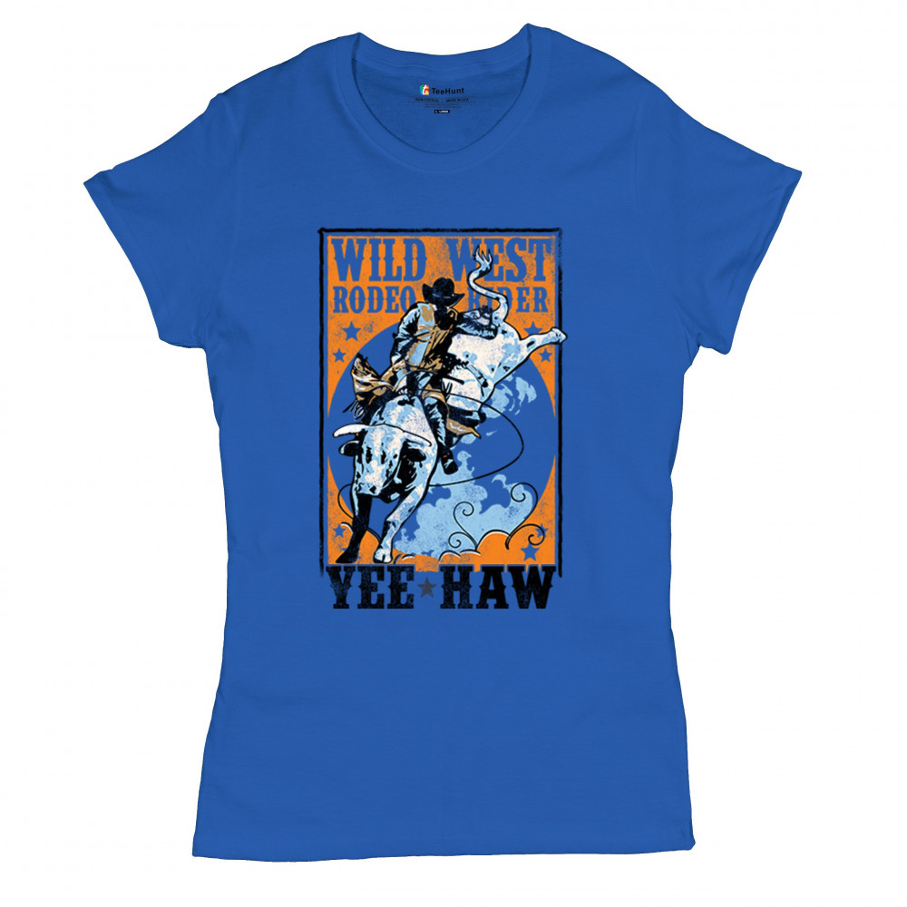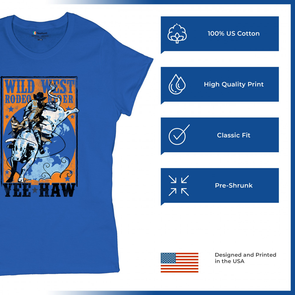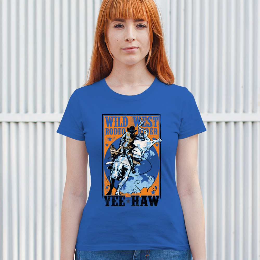 Bold cowboy bull riding design with orange backdrop, perfect for rodeo fans, western events, and country festivals.