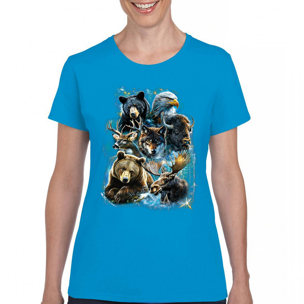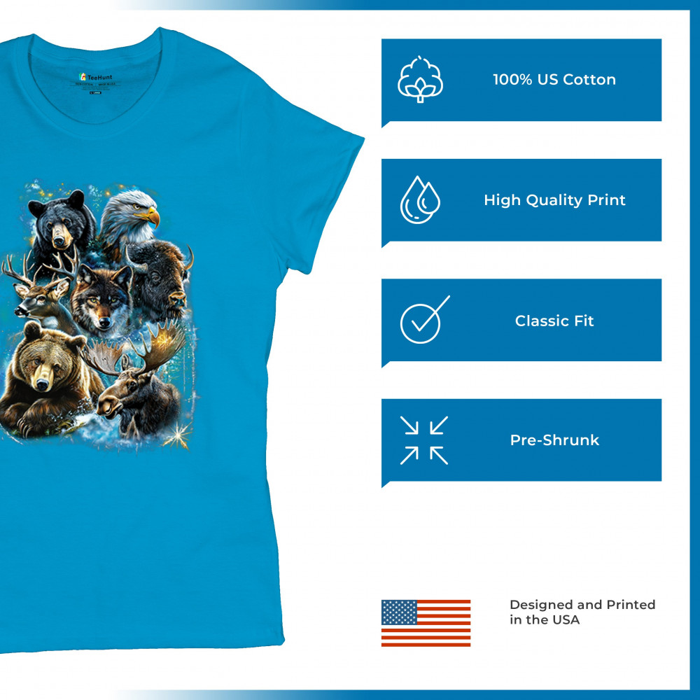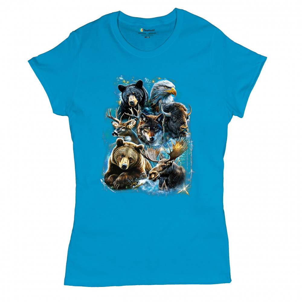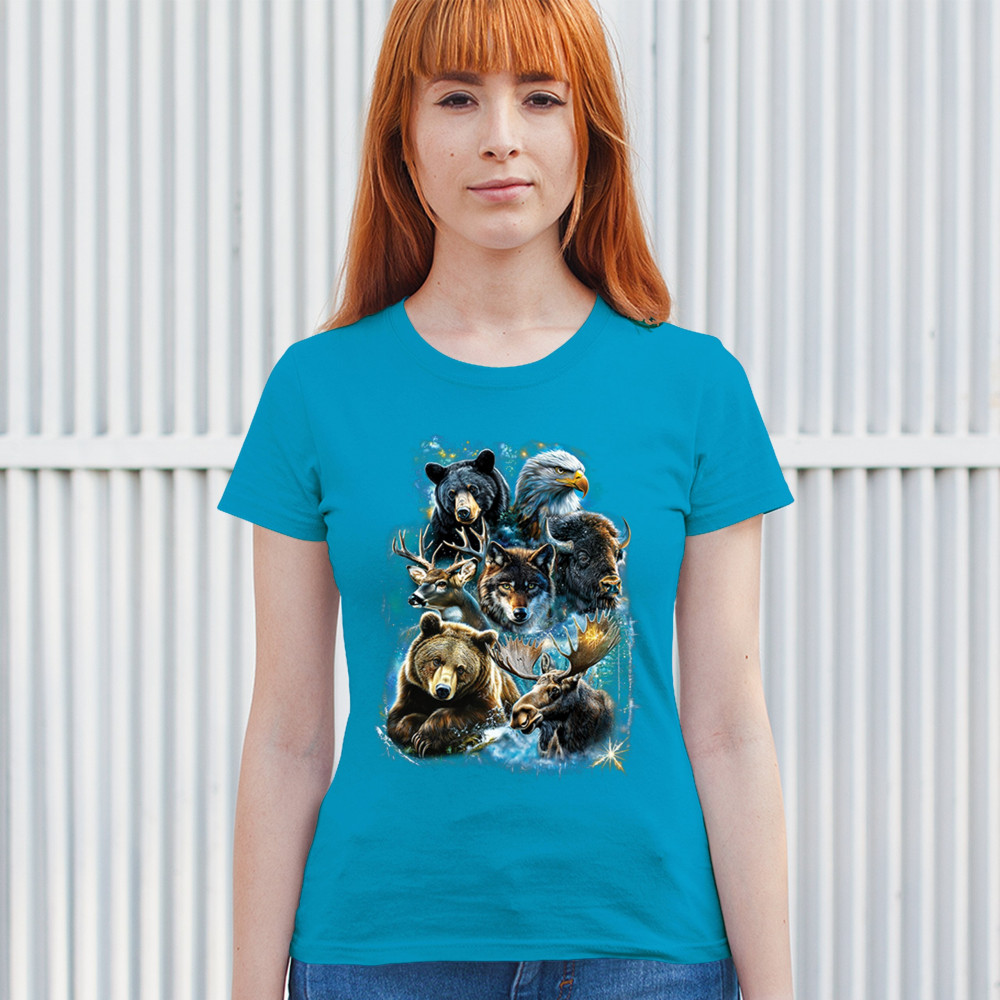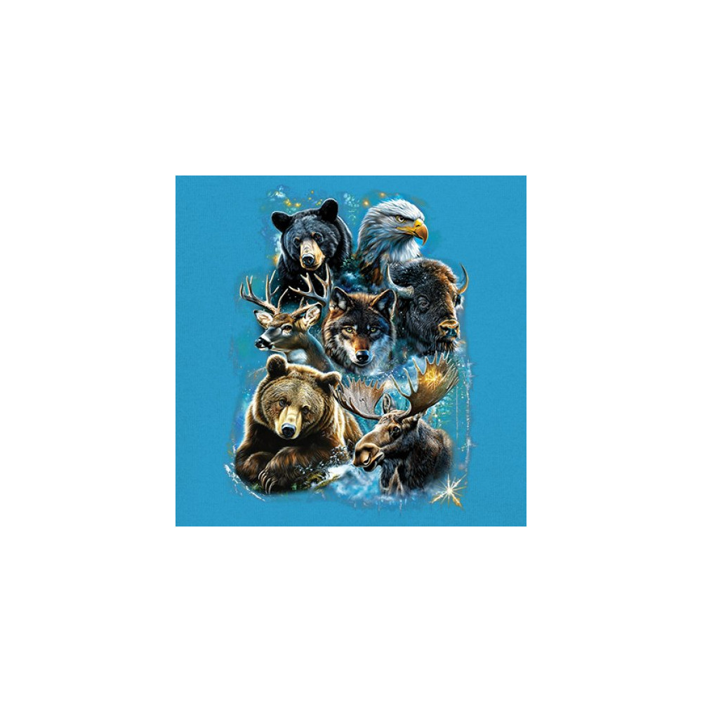 Wilderness design with moose, bear, eagle, bison, and wolf. A bold tribute to forest animals, nature strength, and rugged outdoor spirit.