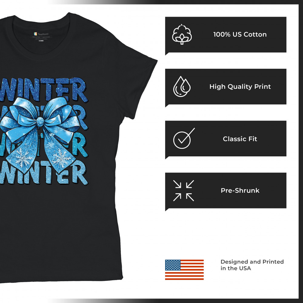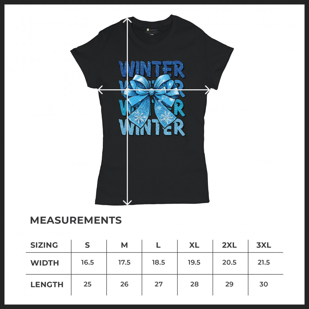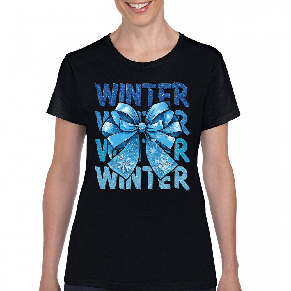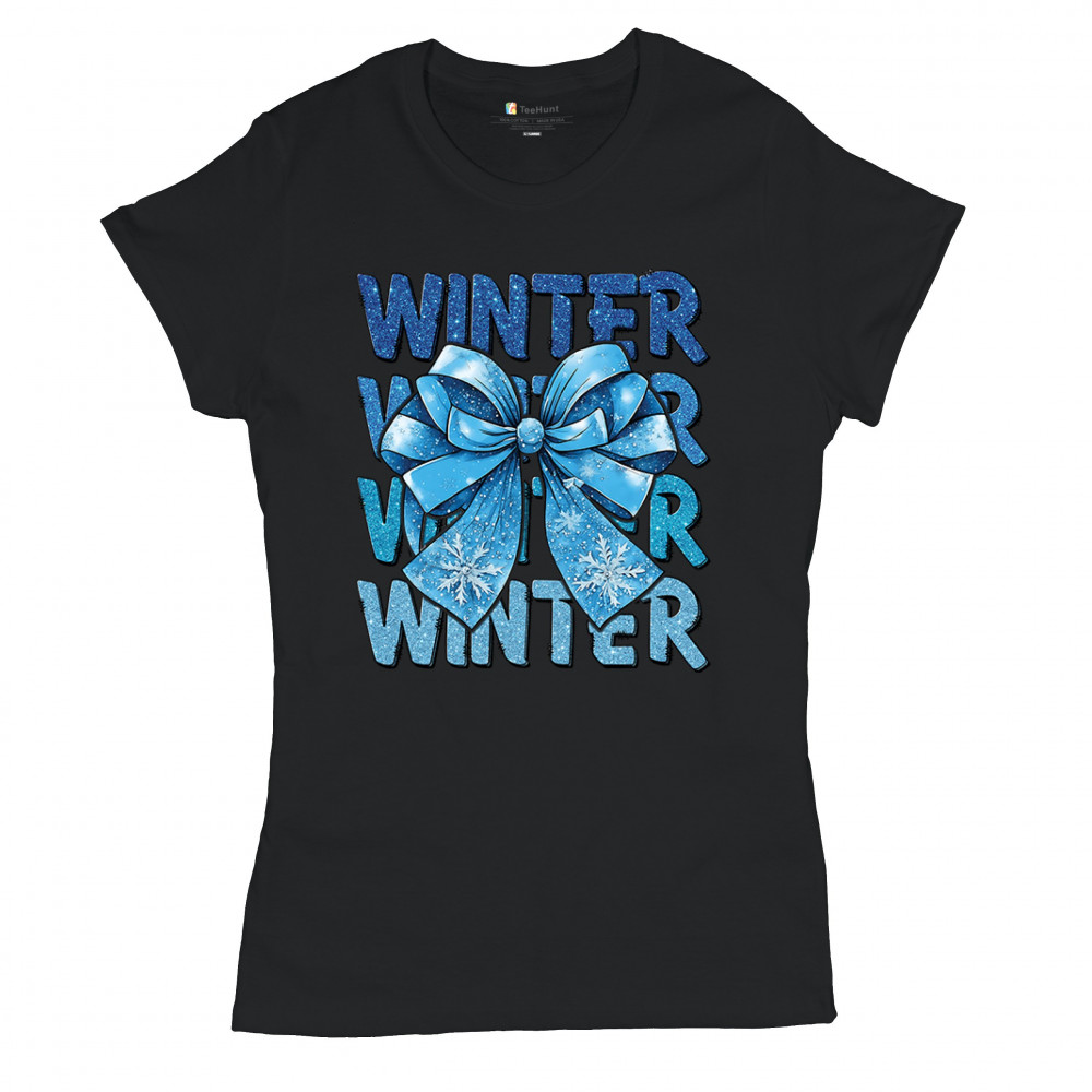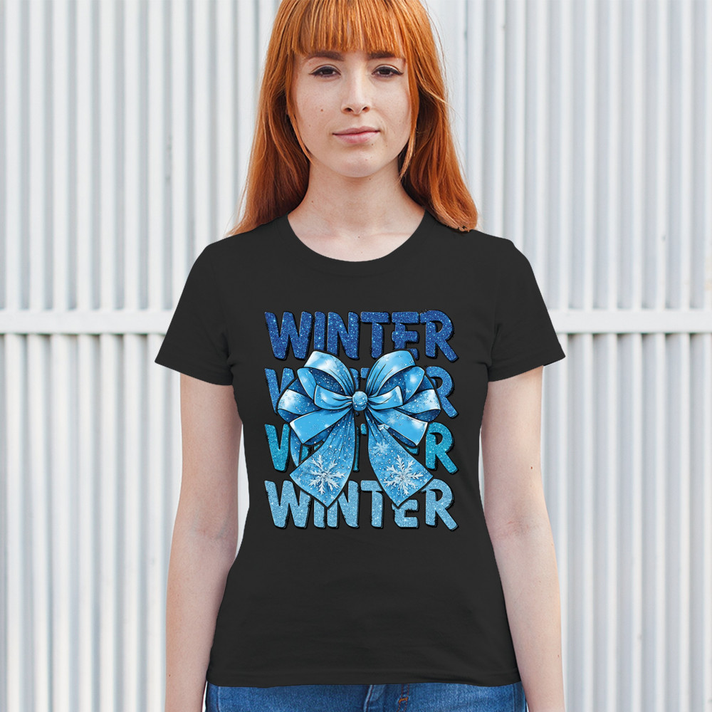 This shimmering winter bow design blends icy blue glitter style with bold repeating WINTER text for a bright seasonal statement. Snowflake accents and frosty tones create a cozy, cheerful vibe perfect for holiday outfits, gifting, or cold-weather lovers. A standout graphic that brings festive winter charm to any wardrobe and boosts seasonal search visibility.