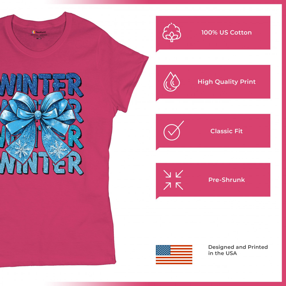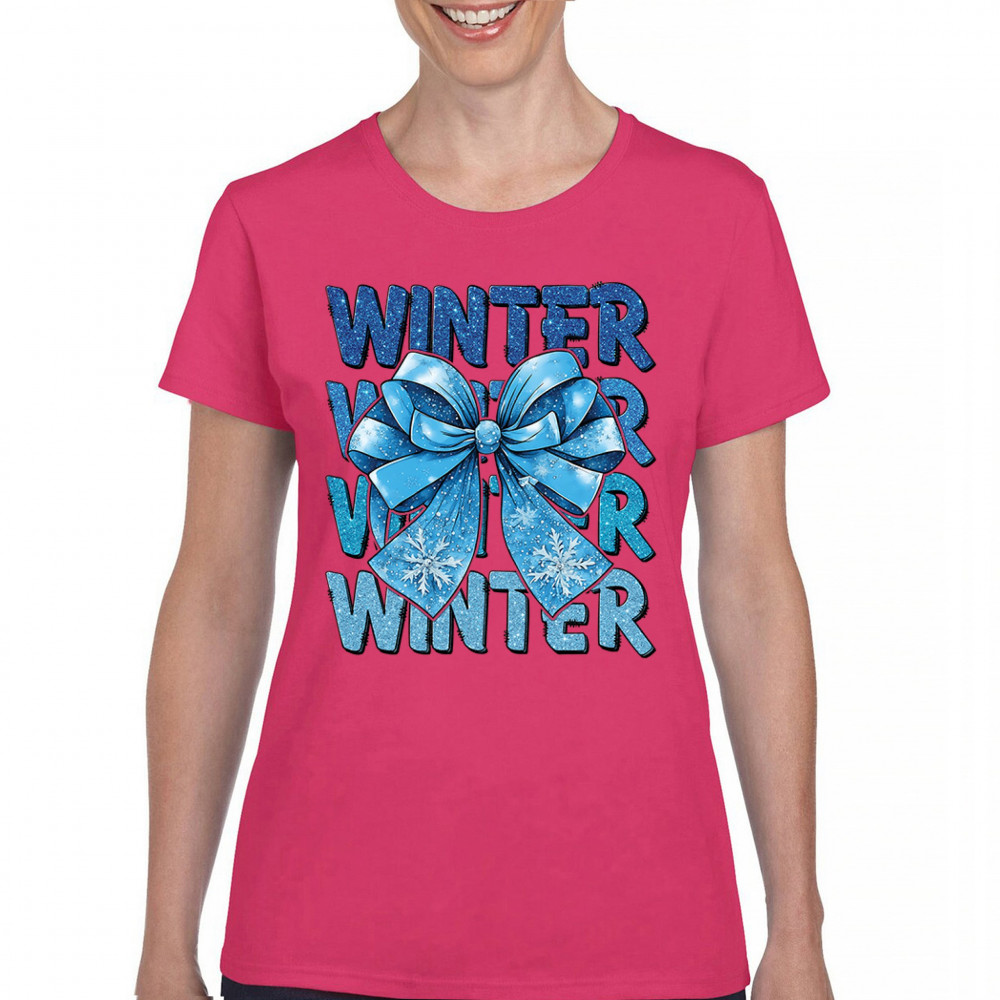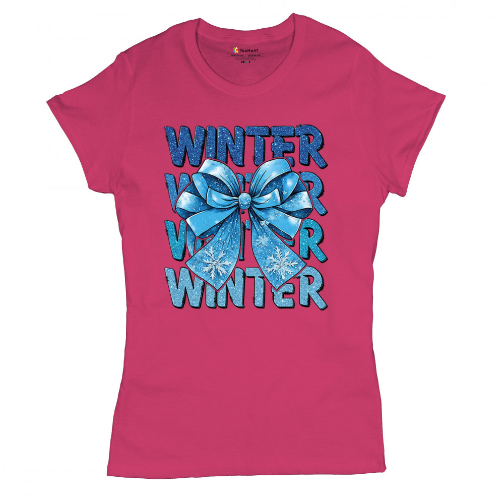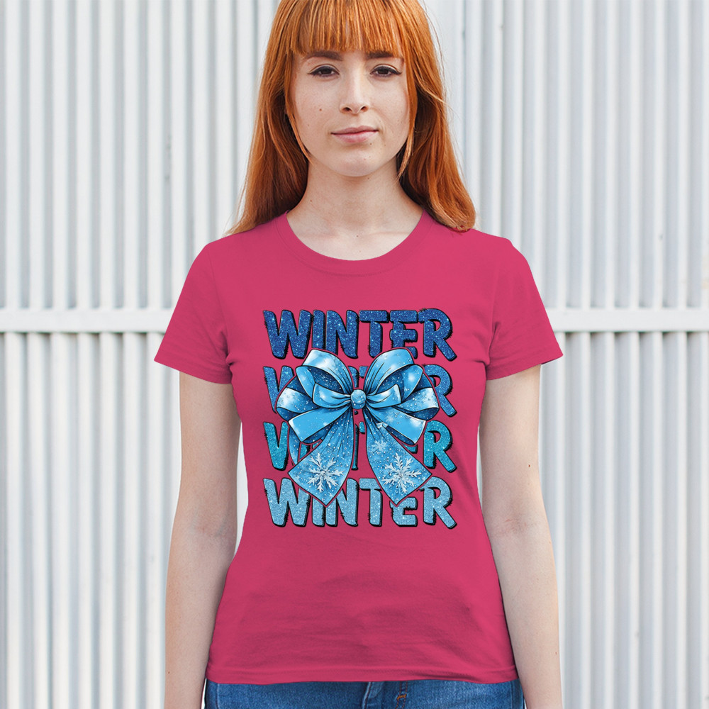 This shimmering winter bow design blends icy blue glitter style with bold repeating WINTER text for a bright seasonal statement. Snowflake accents and frosty tones create a cozy, cheerful vibe perfect for holiday outfits, gifting, or cold-weather lovers. A standout graphic that brings festive winter charm to any wardrobe and boosts seasonal search visibility.