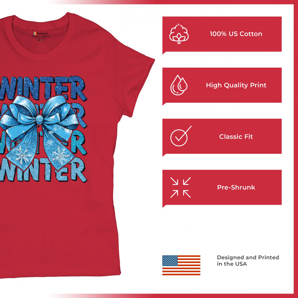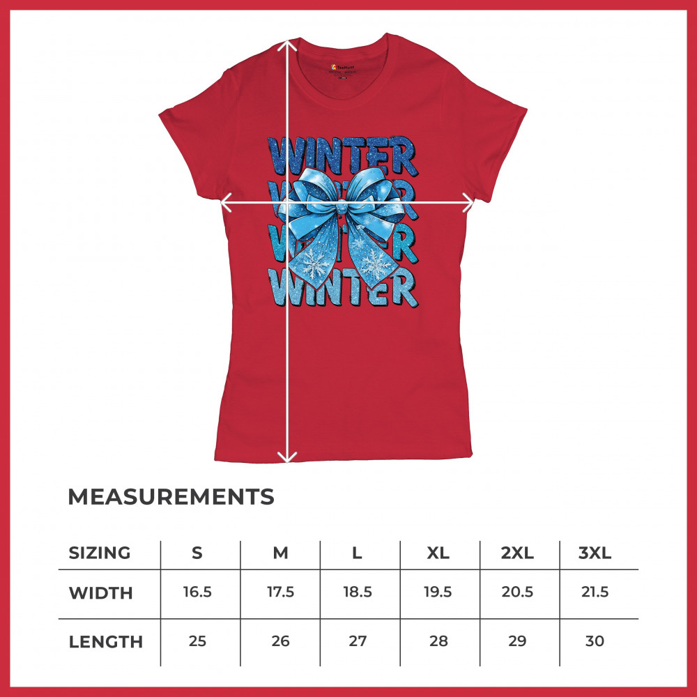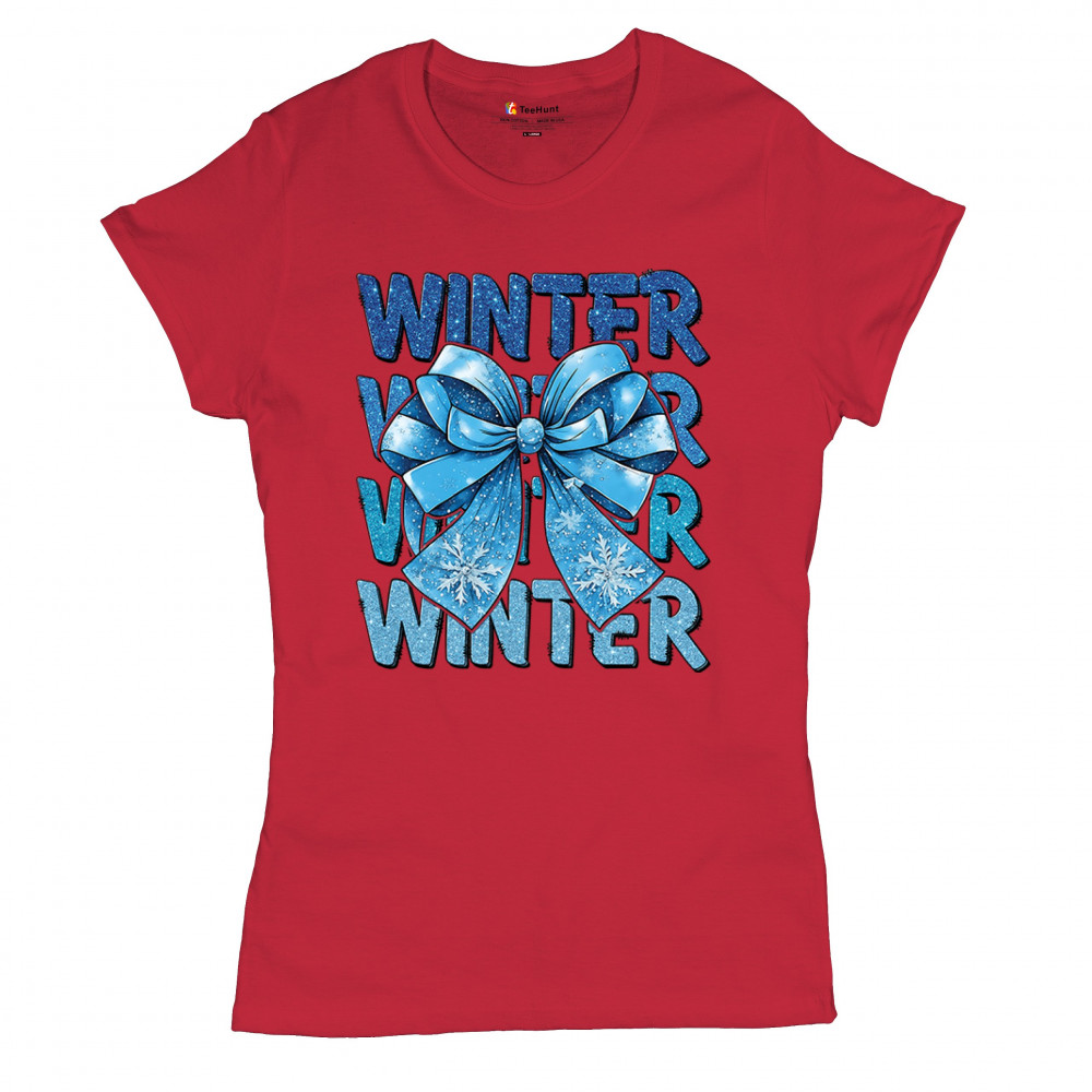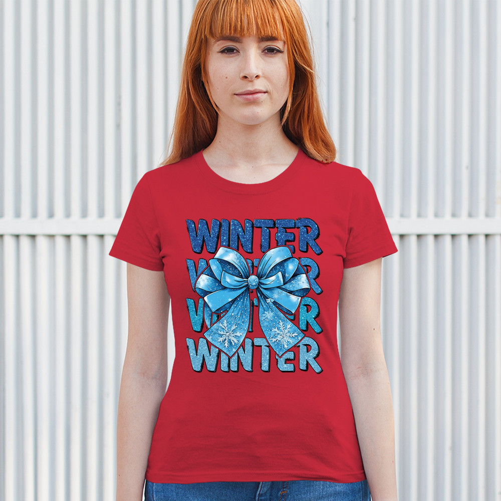 This shimmering winter bow design blends icy blue glitter style with bold repeating WINTER text for a bright seasonal statement. Snowflake accents and frosty tones create a cozy, cheerful vibe perfect for holiday outfits, gifting, or cold-weather lovers. A standout graphic that brings festive winter charm to any wardrobe and boosts seasonal search visibility.