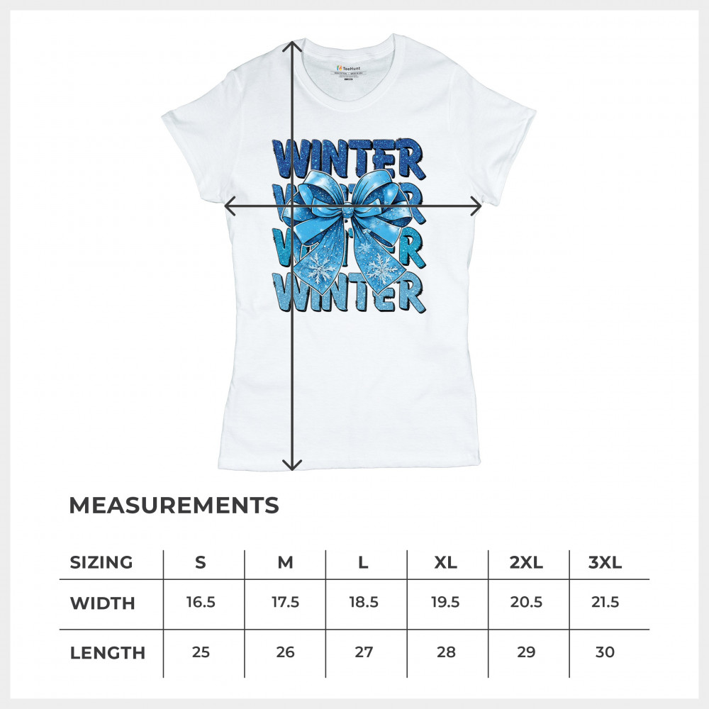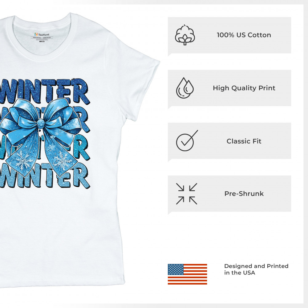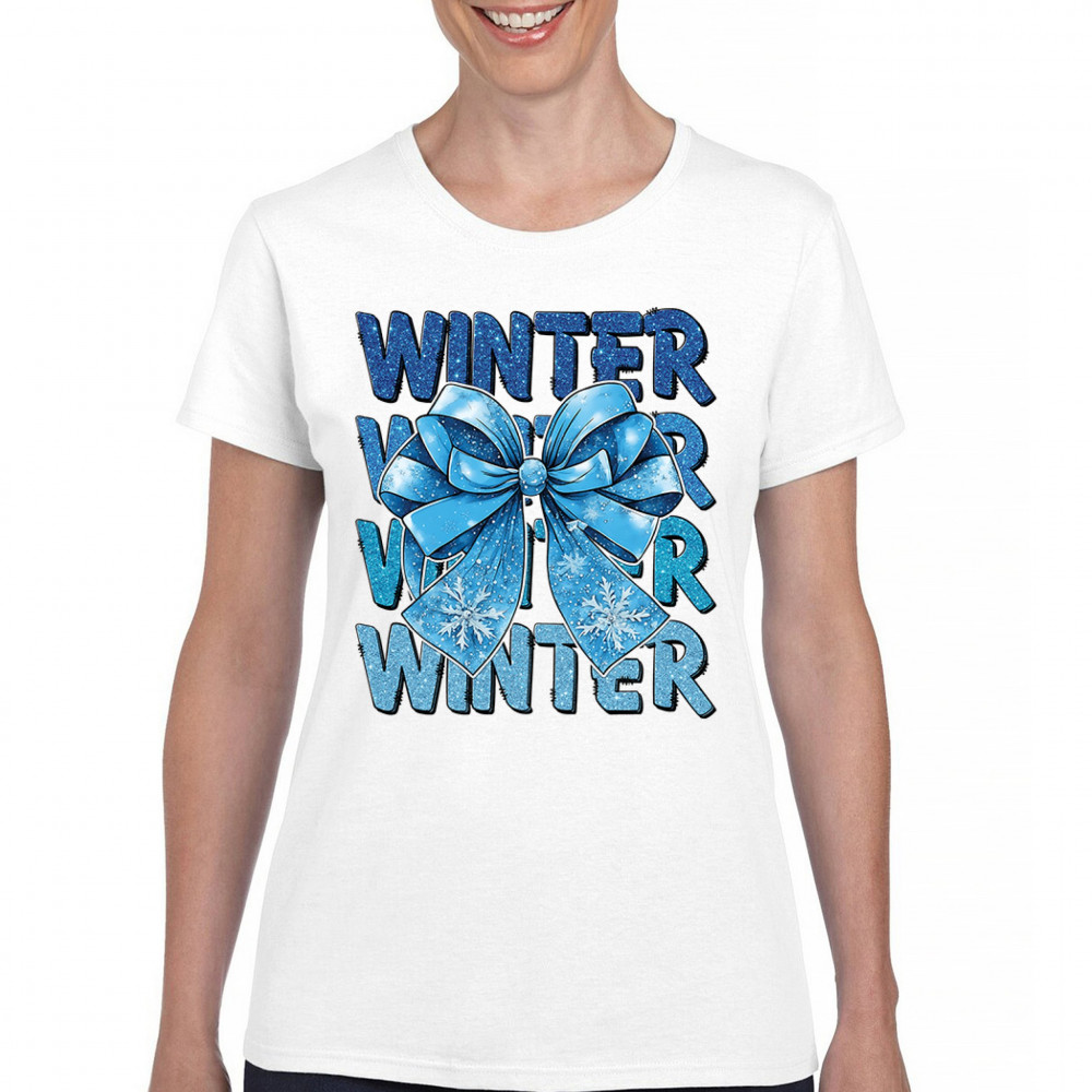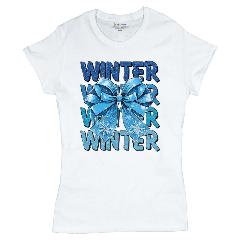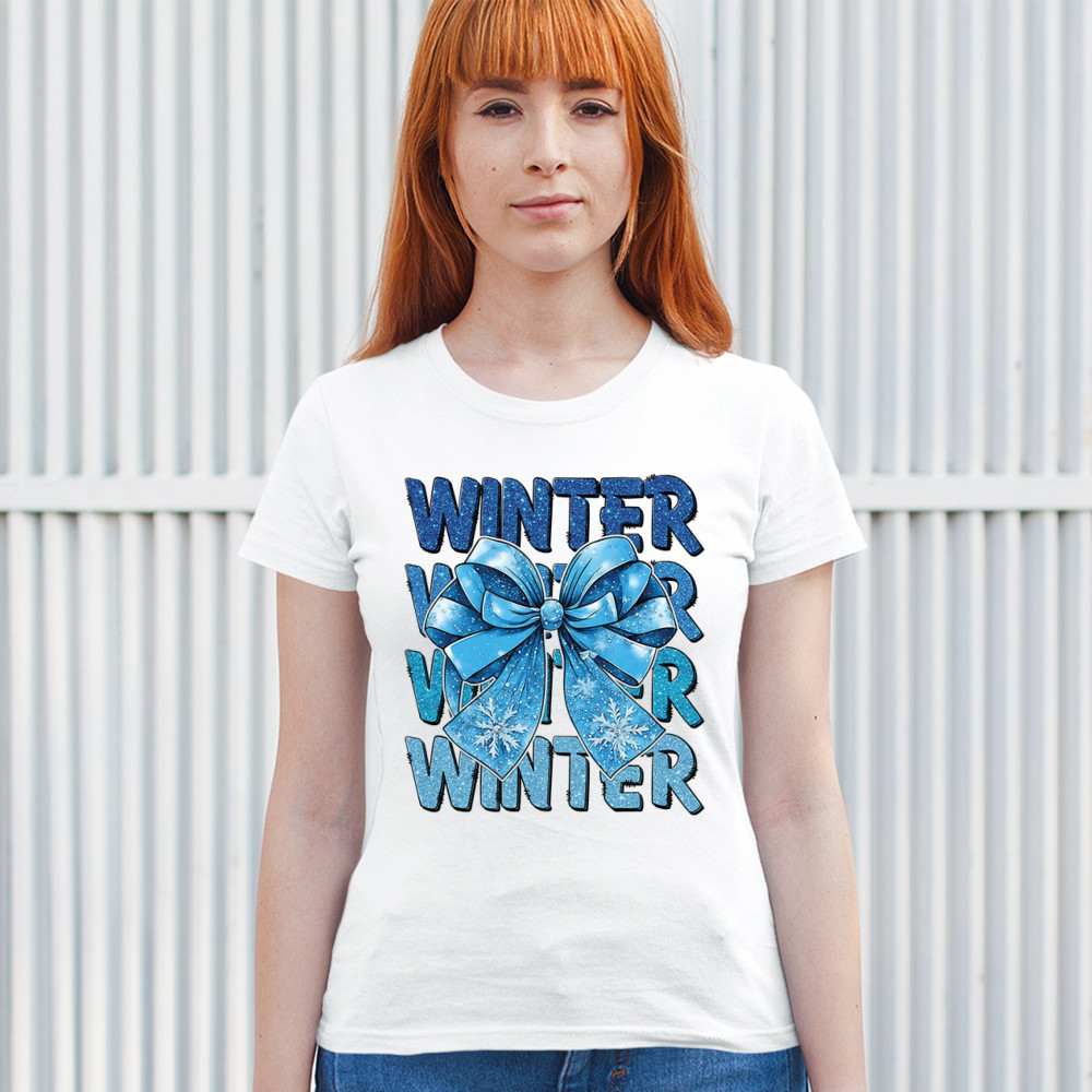 This shimmering winter bow design blends icy blue glitter style with bold repeating WINTER text for a bright seasonal statement. Snowflake accents and frosty tones create a cozy, cheerful vibe perfect for holiday outfits, gifting, or cold-weather lovers. A standout graphic that brings festive winter charm to any wardrobe and boosts seasonal search visibility.