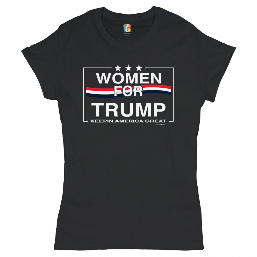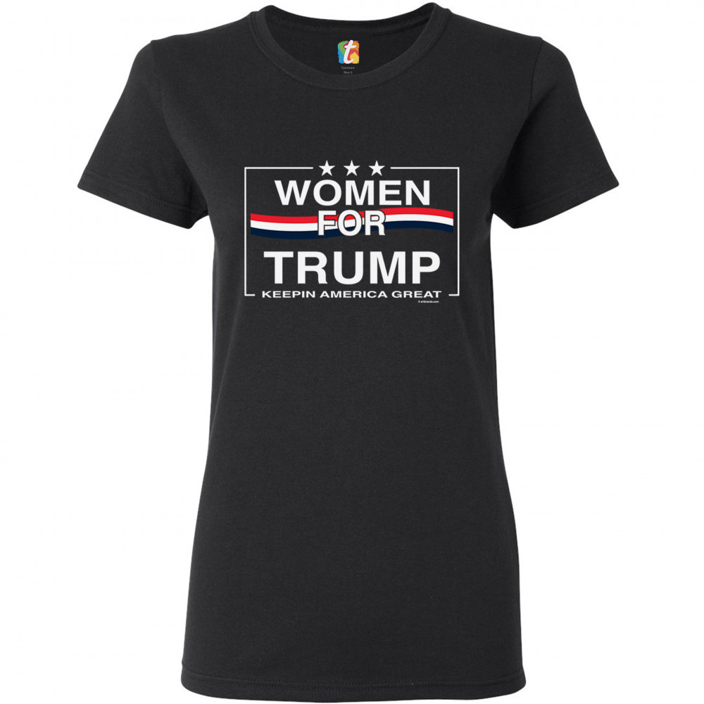 A political print saying "Women for Trump keepin America great". There are three stars above the caption and in the background there is a three-colored stripe. A great choice to wear for a Trump rally or give as a gift to a Donald Trump and Mike Pence supporter before 2020 presidential elections.