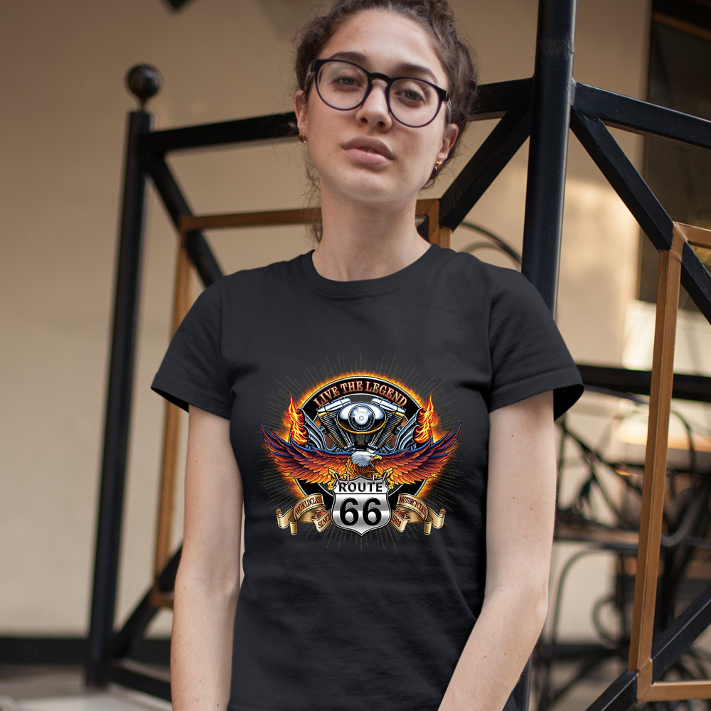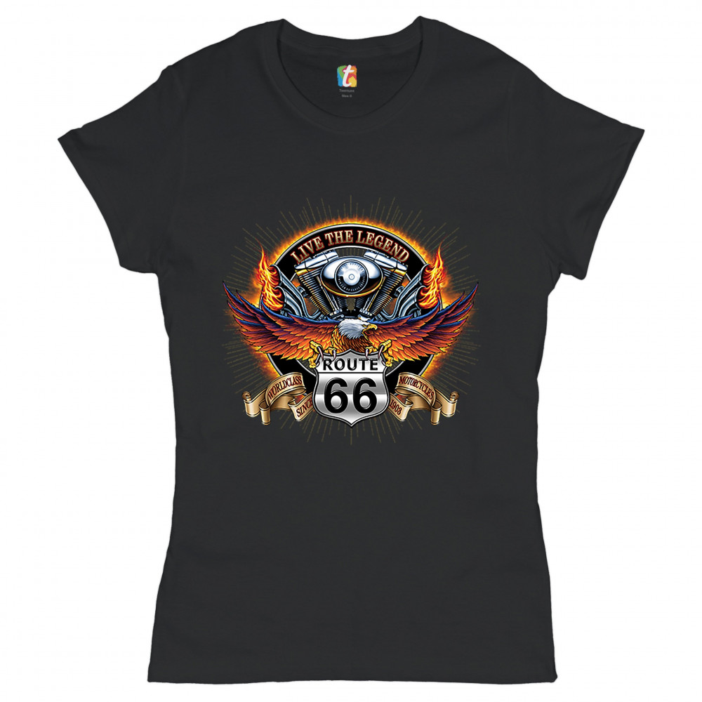 A print featuring an American bald eagle spreading it's wings while sitting on a "Route 66" sign. On a stripe behind the sign it says: "worldclass motorcycles since 1903". In the background there is a motorcycle engine with words: "live the legend" above