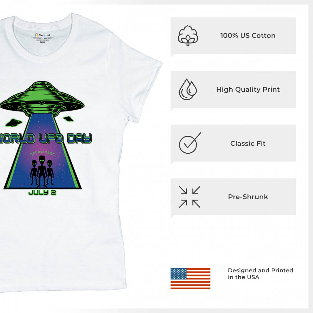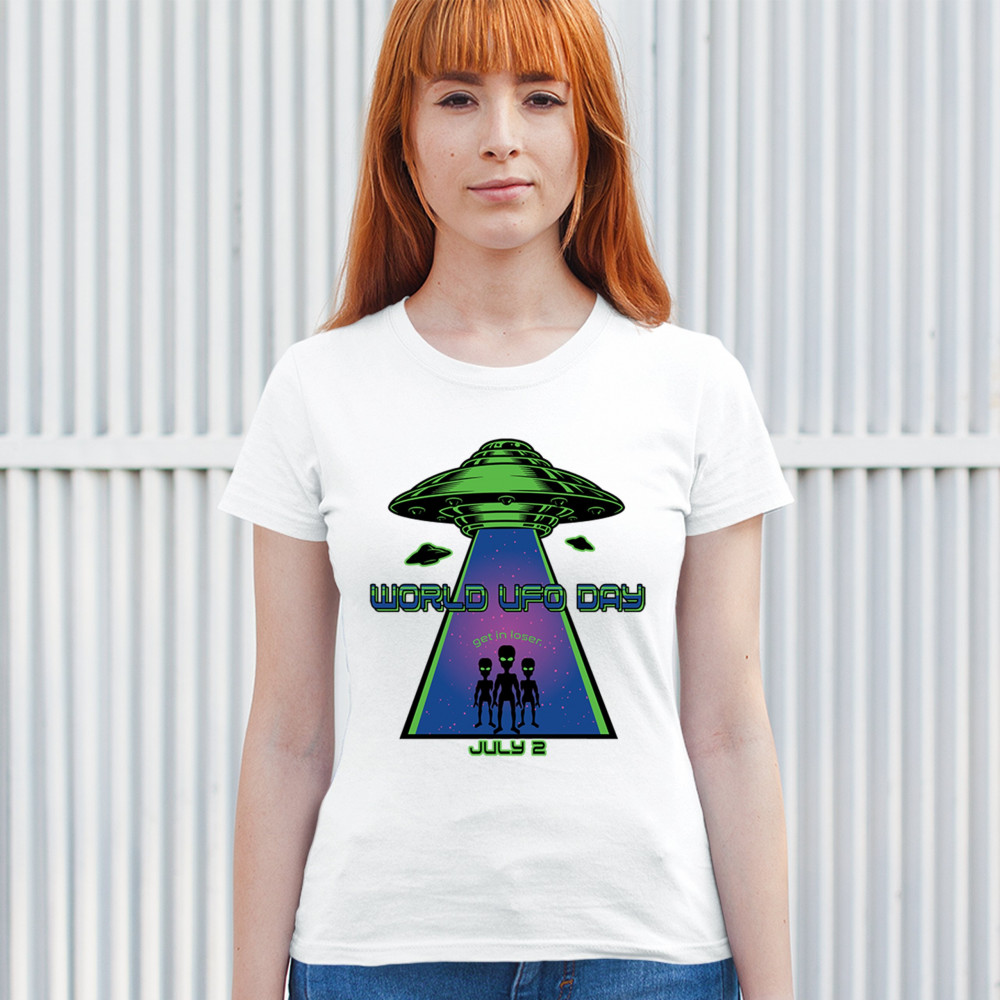 Join the celebration of World UFO Day with this unique design, featuring a detailed UFO beaming up three cheerful aliens with the phrase "Get in, loser." Perfect for those who are fascinated by the unknown and have a sense of humor about extraterrestrial life. Whether you're attending a UFO event, meeting with fellow enthusiasts, or just want to express your quirky style, this design is a must-have. Embrace the spirit of curiosity and fun with this eye-catching design for July 2nd.