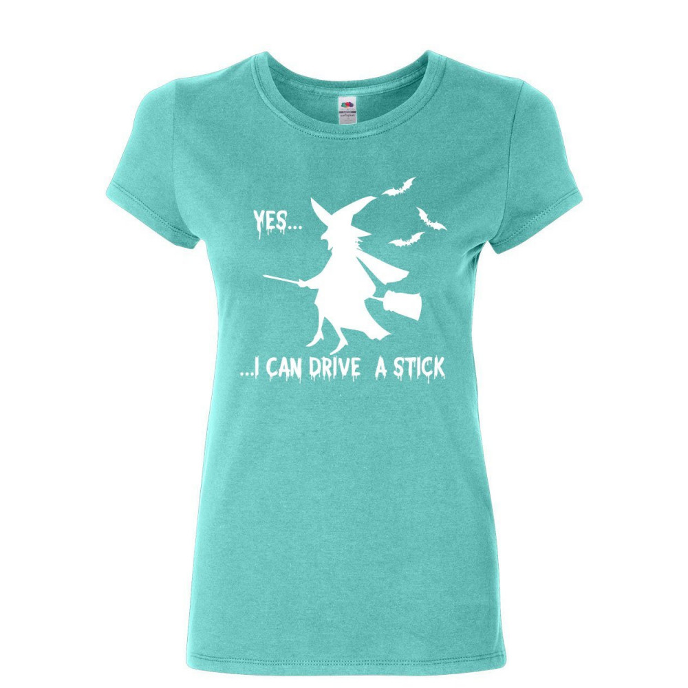 YES, I CAN DRIVE A STICK cotton t-shirt funny halloween witch light blue
