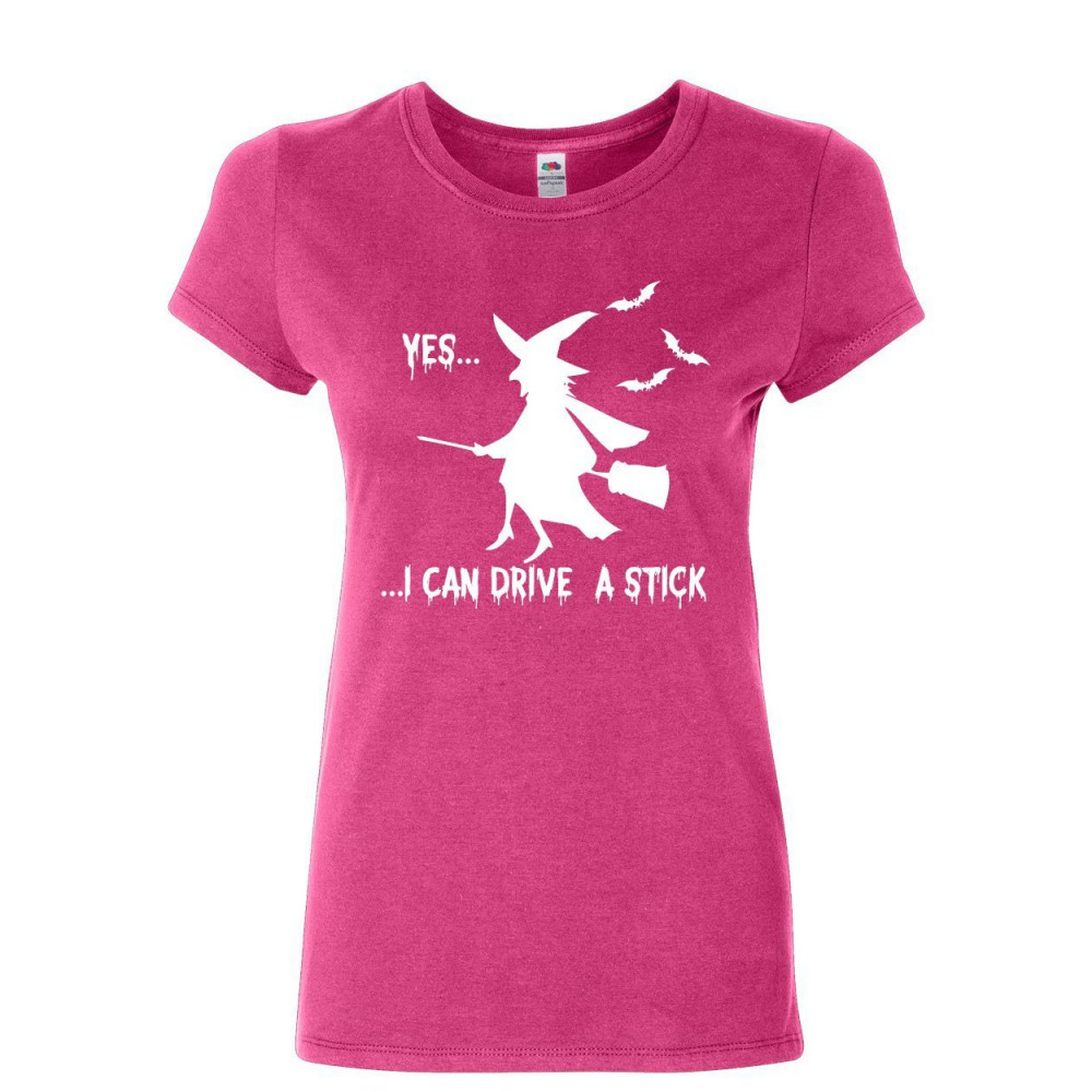 YES, I CAN DRIVE A STICK cotton t-shirt funny halloween witch pink